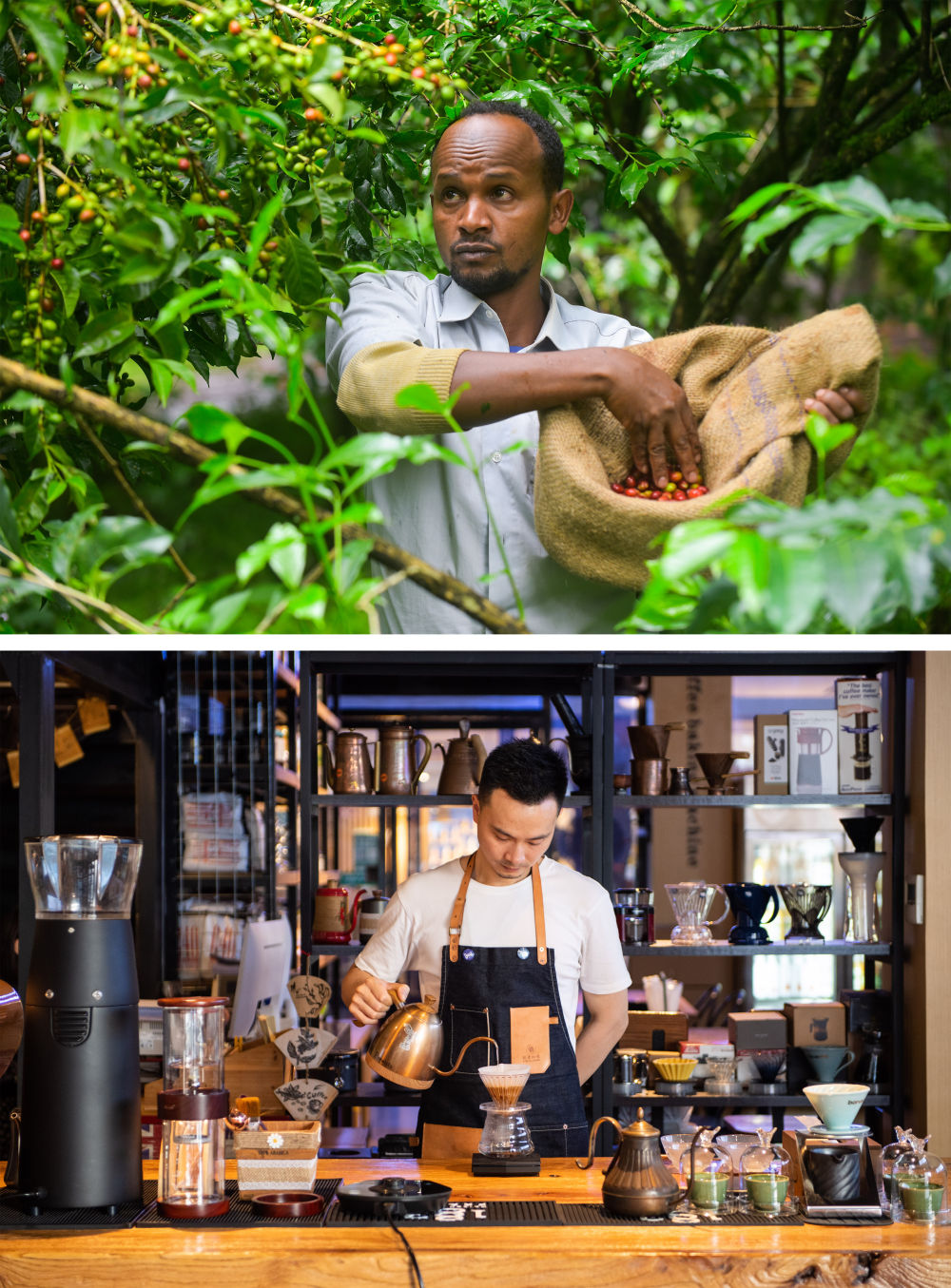 上圖:2021年9月22日,在埃塞俄比亞奧羅米亞州戈馬地區(qū)的一個(gè)咖啡園,農(nóng)民胡森·穆罕默德在采摘咖啡豆;下圖:2021年9月24日,在湖南省長(zhǎng)沙市高橋大市場(chǎng)非洲咖啡街一家咖啡館,咖啡師彭杰在制作咖啡飲品。隨著中國開放的大門越開越大、中國咖啡消費(fèi)的快速增長(zhǎng),埃塞俄比亞咖啡在中國越來越受歡迎。