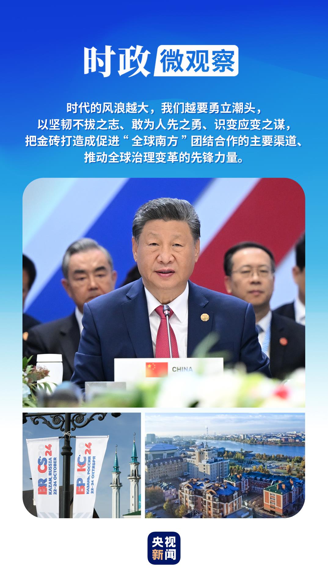 當(dāng)?shù)貢r(shí)間2024年10月23日,習(xí)近平主席出席金磚國家領(lǐng)導(dǎo)人第十六次會(huì)晤并發(fā)表重要講話。面對是任由世界動(dòng)蕩不安,還是推動(dòng)其重回和平發(fā)展正道的關(guān)鍵抉擇,習(xí)近平主席給出中國答案:“時(shí)代的風(fēng)浪越大,我們越要勇立潮頭,以堅(jiān)韌不拔之志、敢為人先之勇、識(shí)變應(yīng)變之謀,把金磚打造成促進(jìn)‘全球南方’團(tuán)結(jié)合作的主要渠道、推動(dòng)全球治理變革的先鋒力量?!?/p>