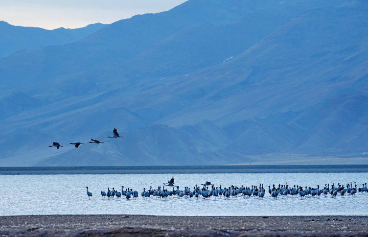 在雅魯藏布江中游河谷黑頸鶴國(guó)家級(jí)自然保護(hù)區(qū),黑頸鶴飛翔在一片水域上空(2024年3月17日攝)。多年來(lái),西藏各級(jí)黨委政府和對(duì)口援藏省市接續(xù)投入2.4億余元資金開(kāi)展生態(tài)建設(shè),創(chuàng)設(shè)的雅江北岸南木林生態(tài)示范區(qū)已完成造林4萬(wàn)多畝,昔日戈壁荒灘漸變江畔綠洲,也成了黑頸鶴越冬的理想棲息地。監(jiān)測(cè)數(shù)據(jù)顯示,西藏境內(nèi)的黑頸鶴種群數(shù)量持續(xù)增長(zhǎng),已由上世紀(jì)的不足3000只增長(zhǎng)到目前的1萬(wàn)余只。