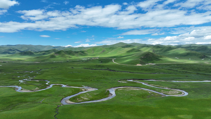 這是2023年7月6日拍攝的甘肅省甘南藏族自治州瑪曲縣阿萬(wàn)倉(cāng)濕地景色(無(wú)人機(jī)照片)?,斍h是黃河上游重要的水源涵養(yǎng)區(qū)和生態(tài)功能區(qū),被稱為“黃河之腎”。多年來(lái),甘肅省實(shí)施退牧還草、退化草原生態(tài)修復(fù)等治理工程,草原生態(tài)環(huán)境明顯改善。