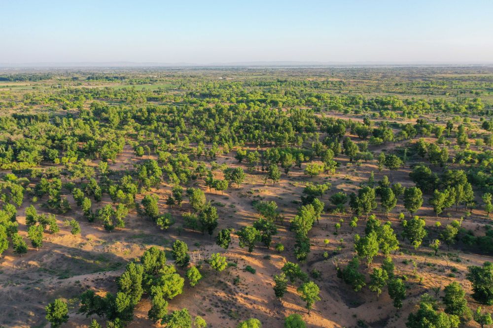 2023年6月14日在內(nèi)蒙古毛烏素沙地拍攝的當(dāng)?shù)啬撩穹N植的一片樹(shù)林(無(wú)人機(jī)照片)。2024年以來(lái),內(nèi)蒙古全面開(kāi)展“三北”工程攻堅(jiān)戰(zhàn),已完成防沙治沙面積約1954萬(wàn)畝,約為年度總?cè)蝿?wù)1730萬(wàn)畝的113%,超額完成年度任務(wù)。
