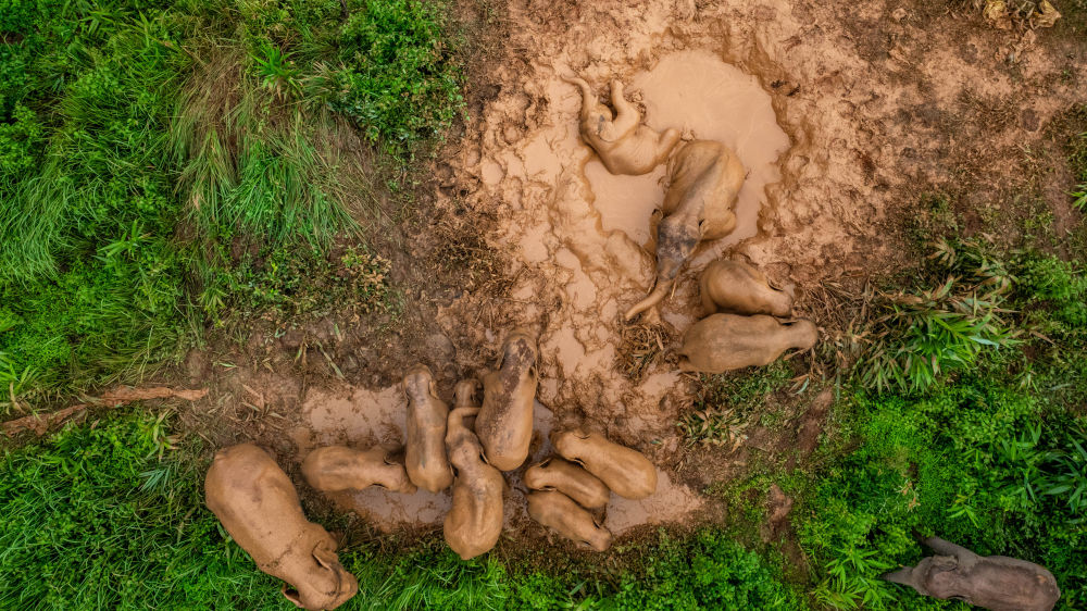 2024年8月8日,“短鼻家族”和“然然家族”的野象在云南省西雙版納州景洪市大渡崗鄉(xiāng)的泥塘里玩耍(無(wú)人機(jī)照片)。近年來(lái),云南修復(fù)改造了一些大象棲息地,種植大象愛(ài)吃的植物,同時(shí)運(yùn)用紅外相機(jī)等技術(shù)手段,實(shí)現(xiàn)亞洲象位置信息的實(shí)時(shí)發(fā)布。