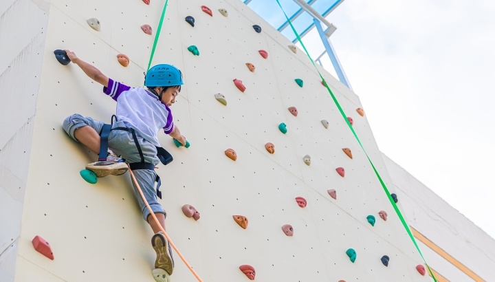 浙江臺州,正在學(xué)習(xí)攀巖課程的小學(xué)生