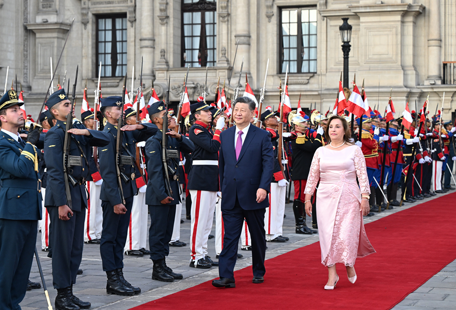 當(dāng)?shù)貢r(shí)間11月14日下午,國(guó)家主席習(xí)近平在利馬總統(tǒng)府同秘魯總統(tǒng)博魯阿爾特舉行會(huì)談。博魯阿爾特在總統(tǒng)府前廣場(chǎng)為習(xí)近平舉行隆重盛大歡迎儀式。新華社記者 謝環(huán)馳 攝