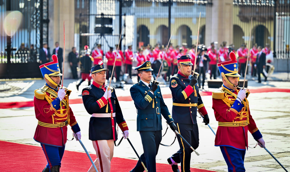 當?shù)貢r間11月14日下午,國家主席習近平同秘魯總統(tǒng)博魯阿爾特舉行會談。在秘魯禮賓馬隊護衛(wèi)下,習近平乘車抵達總統(tǒng)府,受到博魯阿爾特總統(tǒng)熱情迎接。博魯阿爾特在總統(tǒng)府前廣場為習近平舉行隆重盛大歡迎儀式。