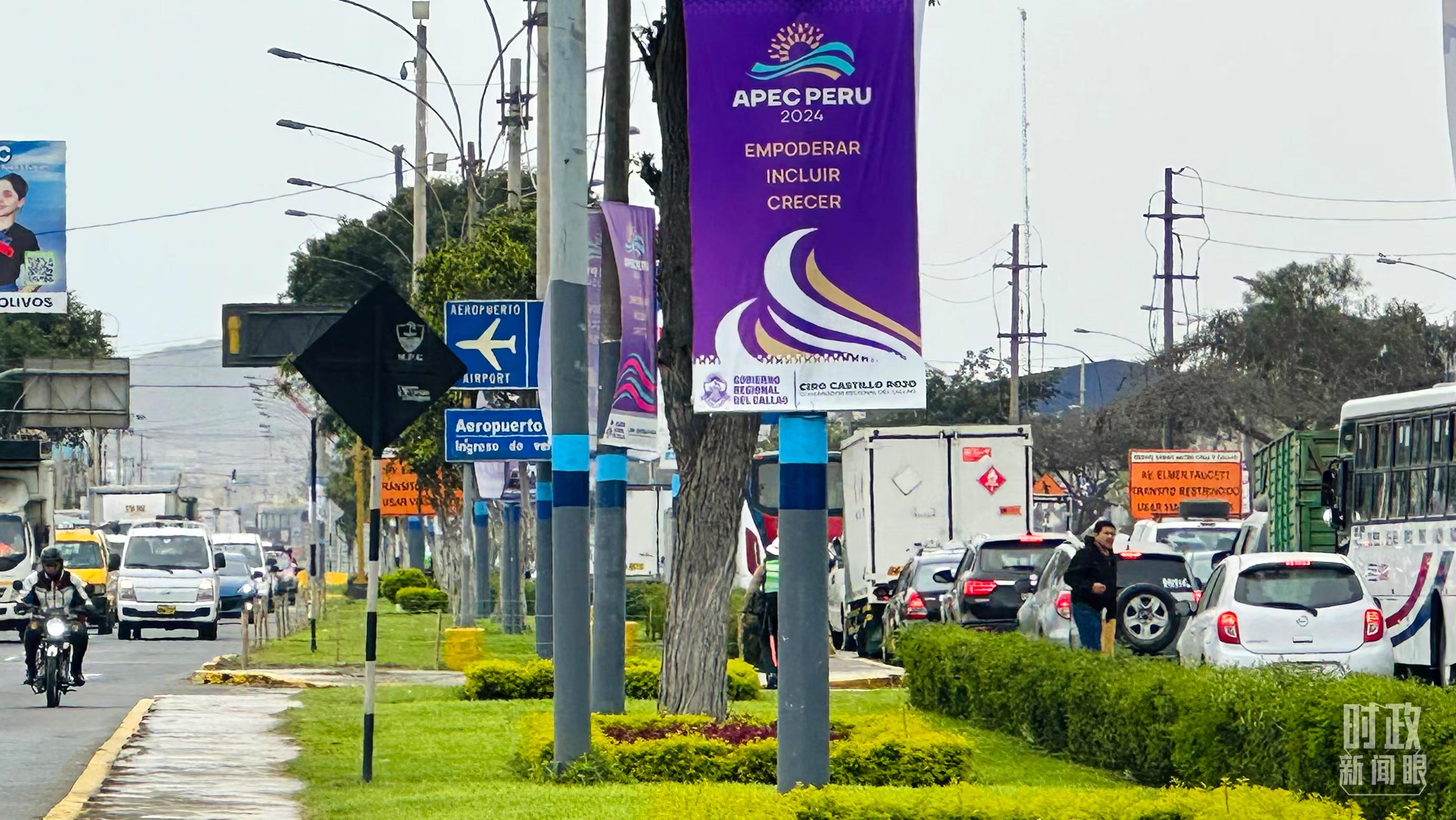 △利馬空軍基地懸掛的中國國旗和APEC會議標(biāo)牌。(總臺央視記者鄂介甫拍攝)