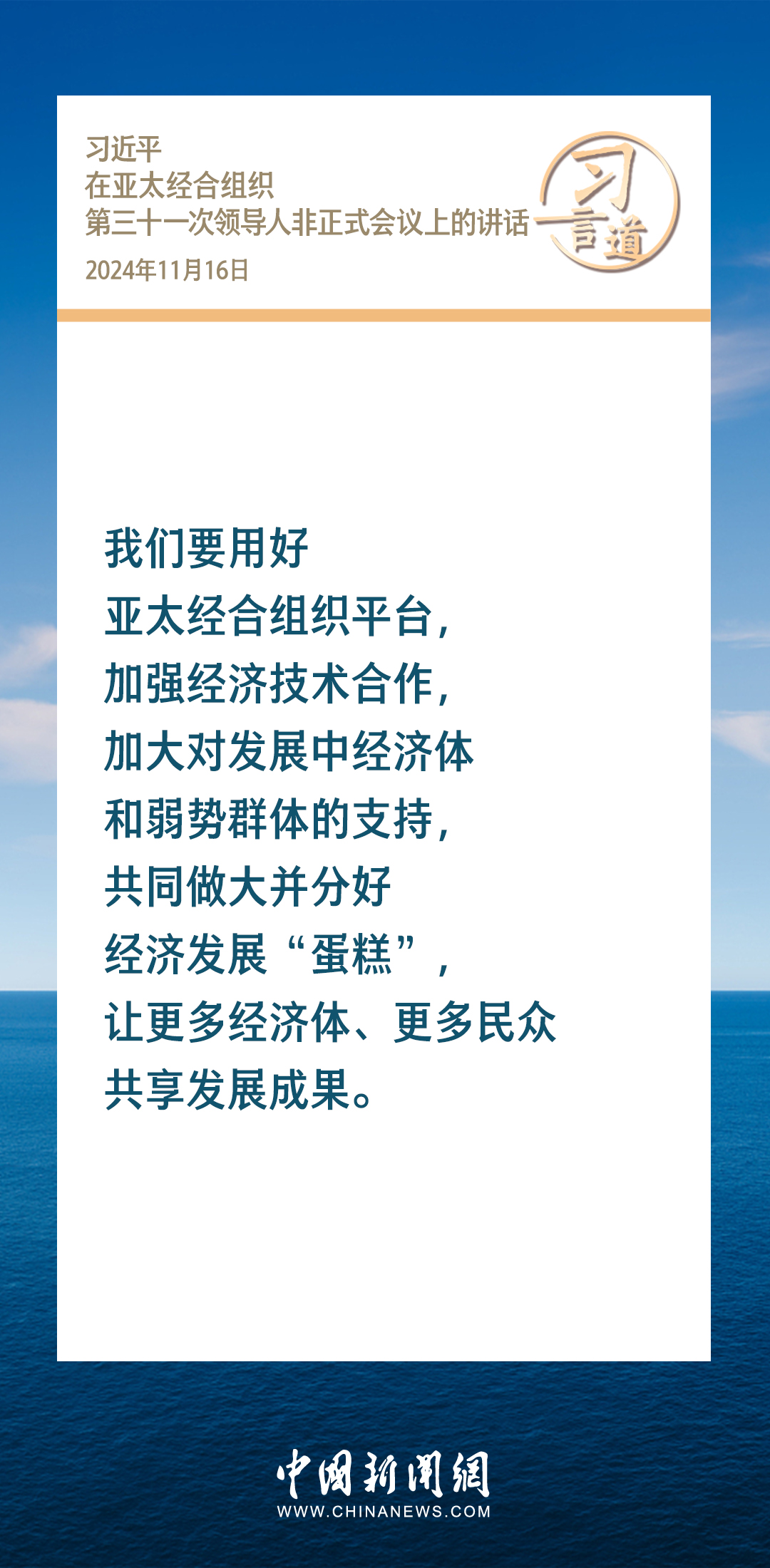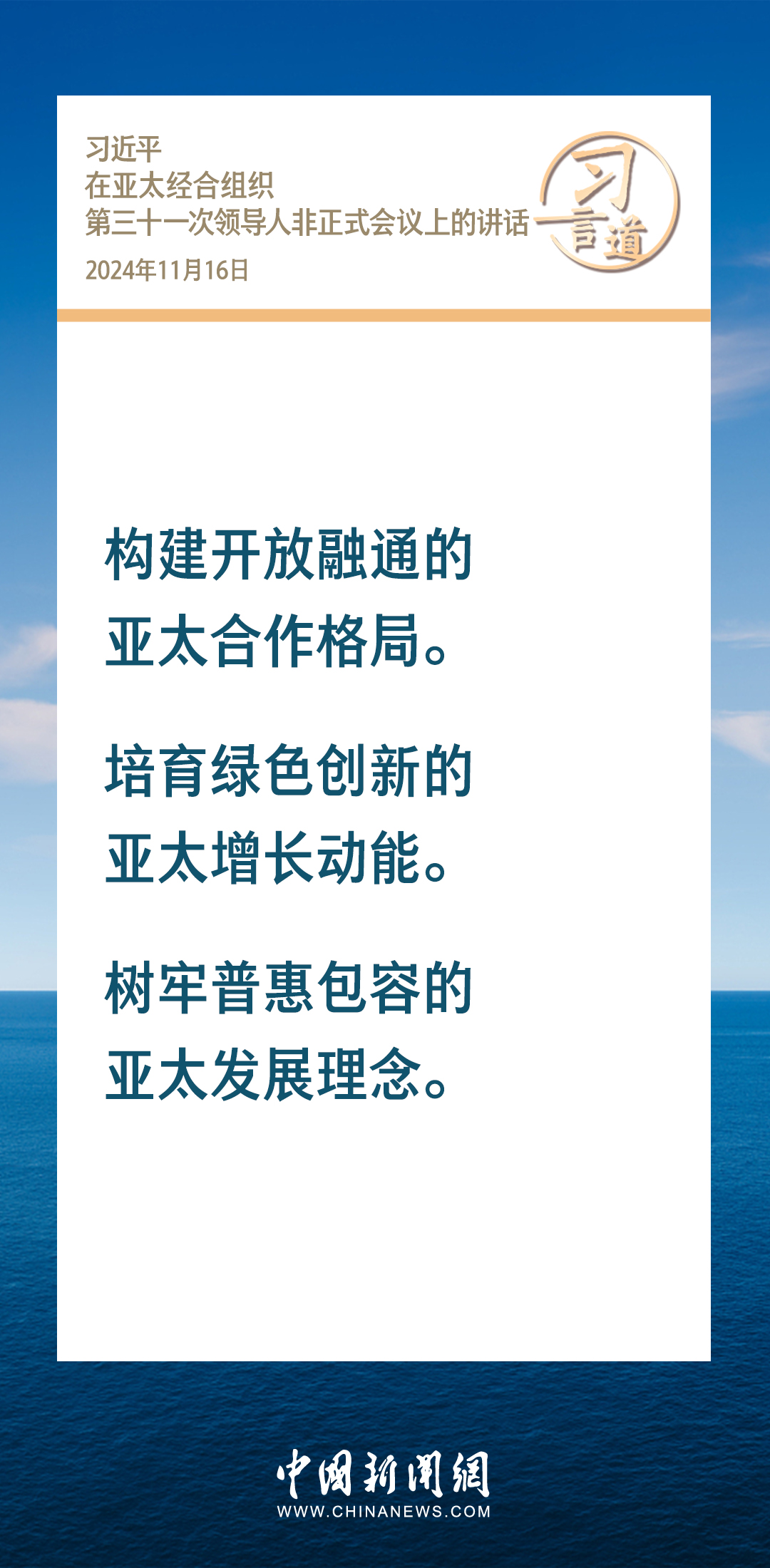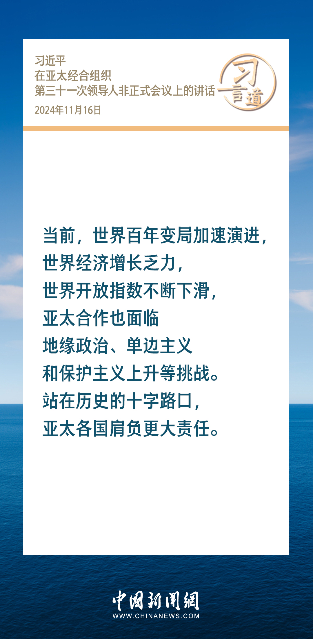 當?shù)貢r間11月16日,國家主席習近平出席亞太經(jīng)合組織第三十一次領導人非正式會議并發(fā)表重要講話。習近平指出——