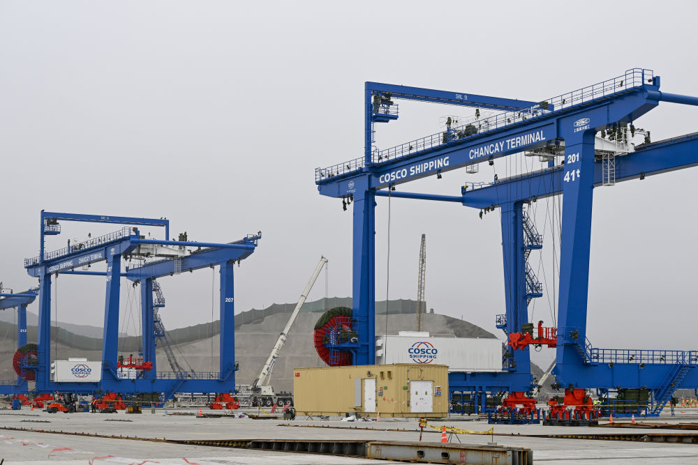 這是2024年6月21日拍攝的秘魯錢(qián)凱港碼頭操作區(qū)建設(shè)現(xiàn)場(chǎng)。