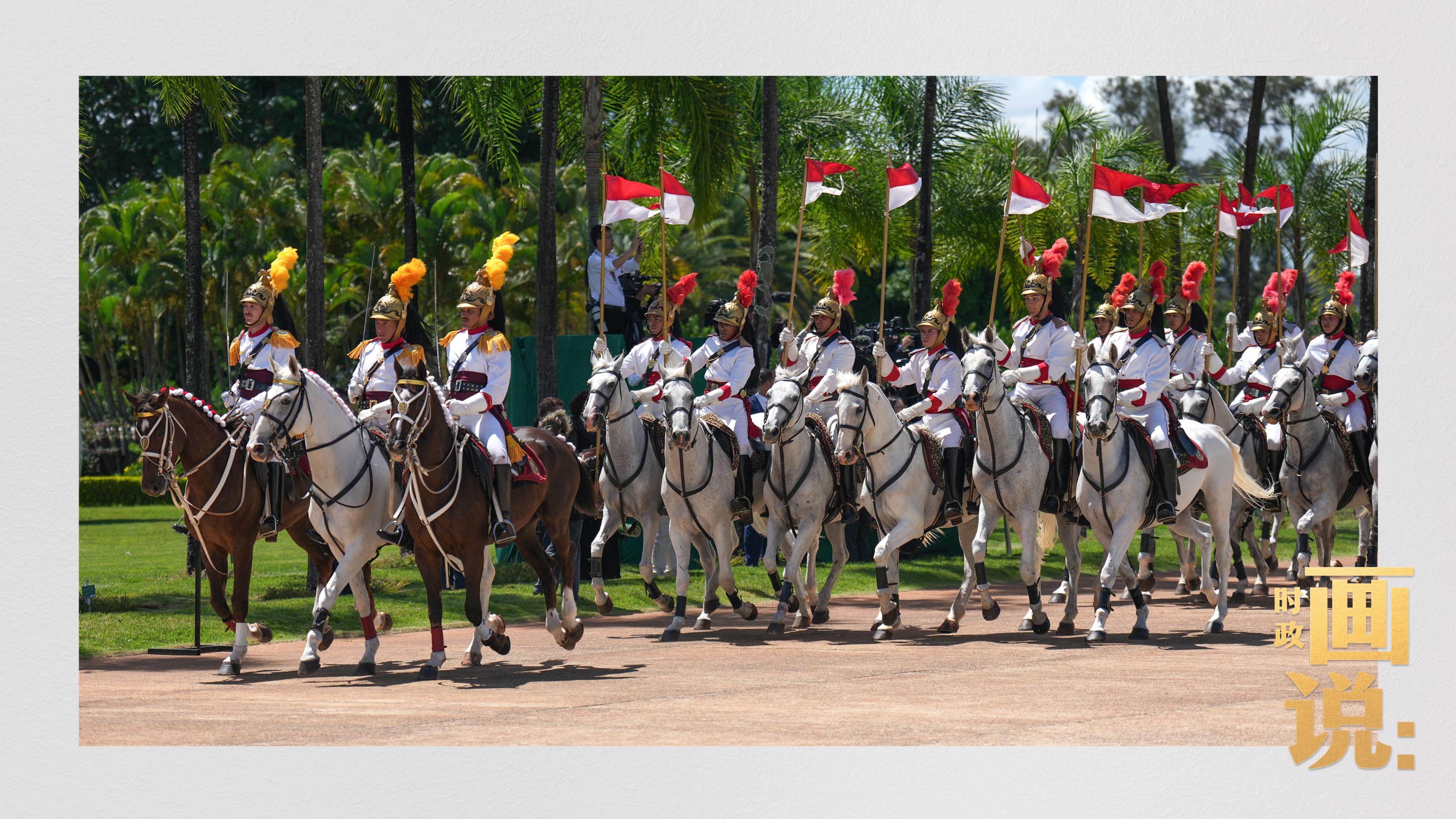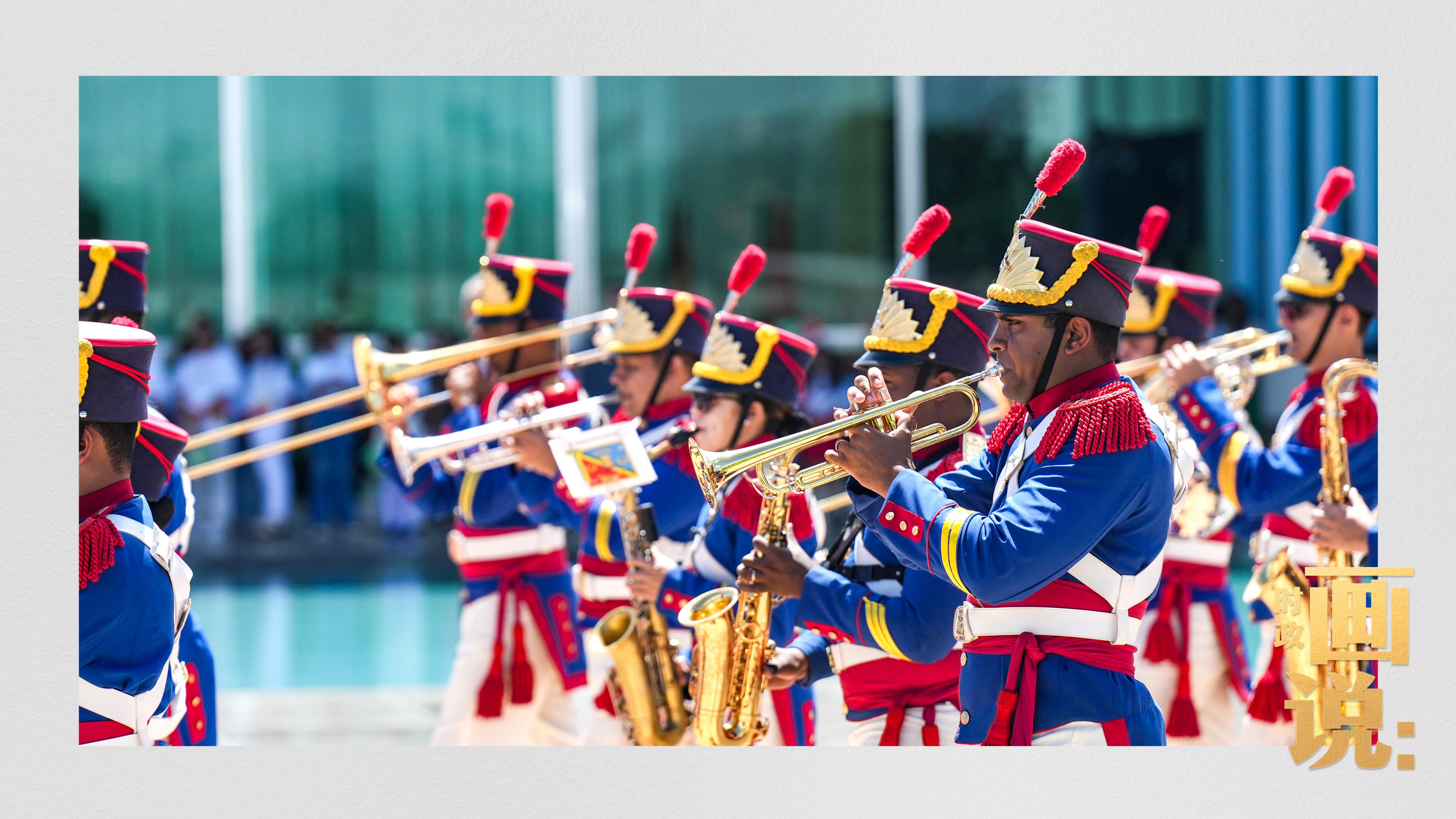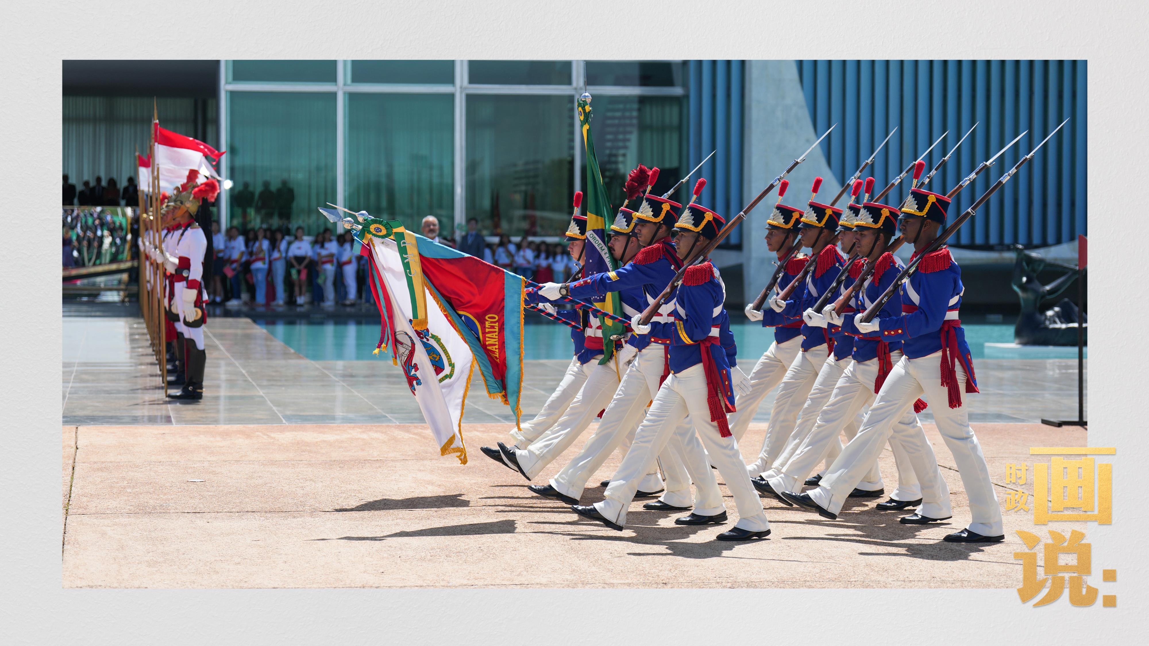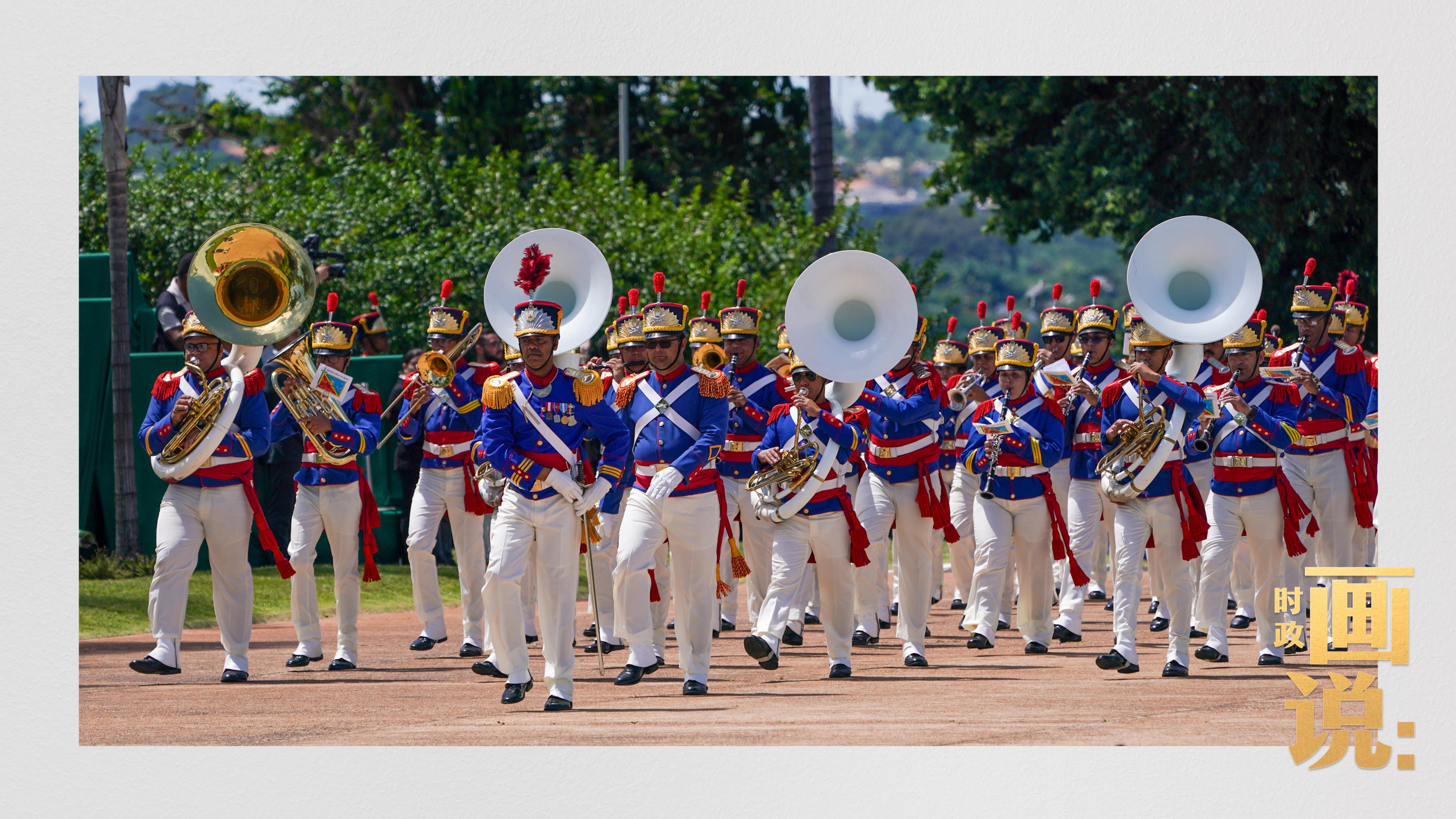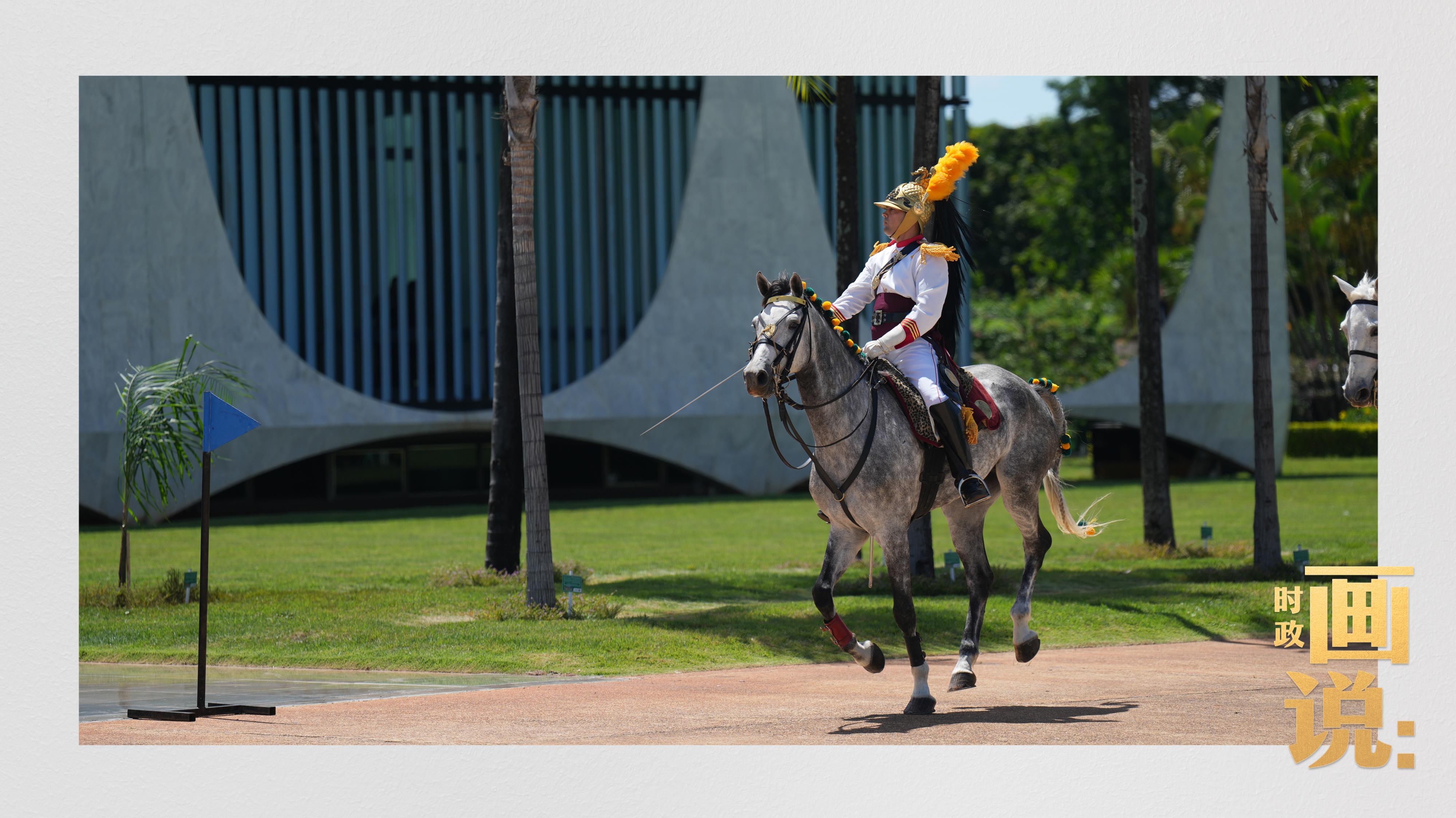 騎兵護衛(wèi)習近平主席專車抵達儀式現(xiàn)場,巴西藝術家用中文深情唱響中國經(jīng)典民歌《我的祖國》,現(xiàn)場氣氛隆重熱烈。