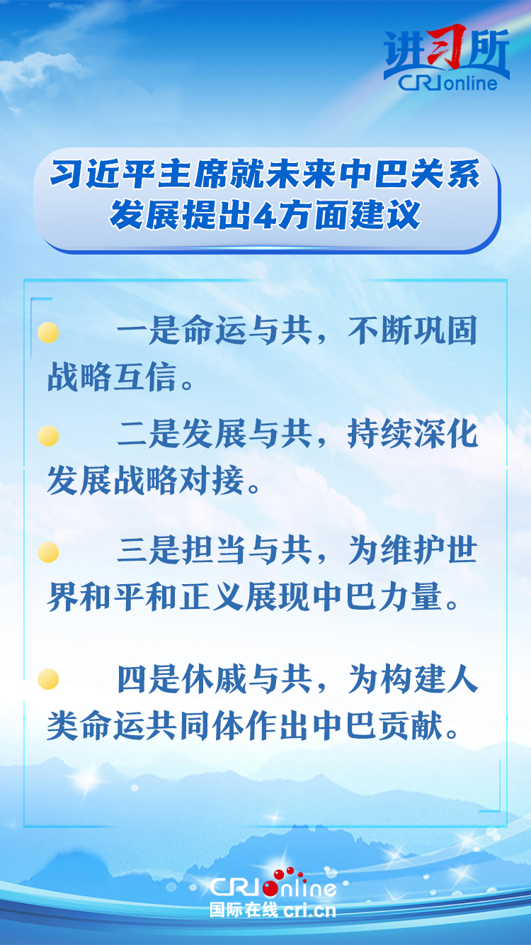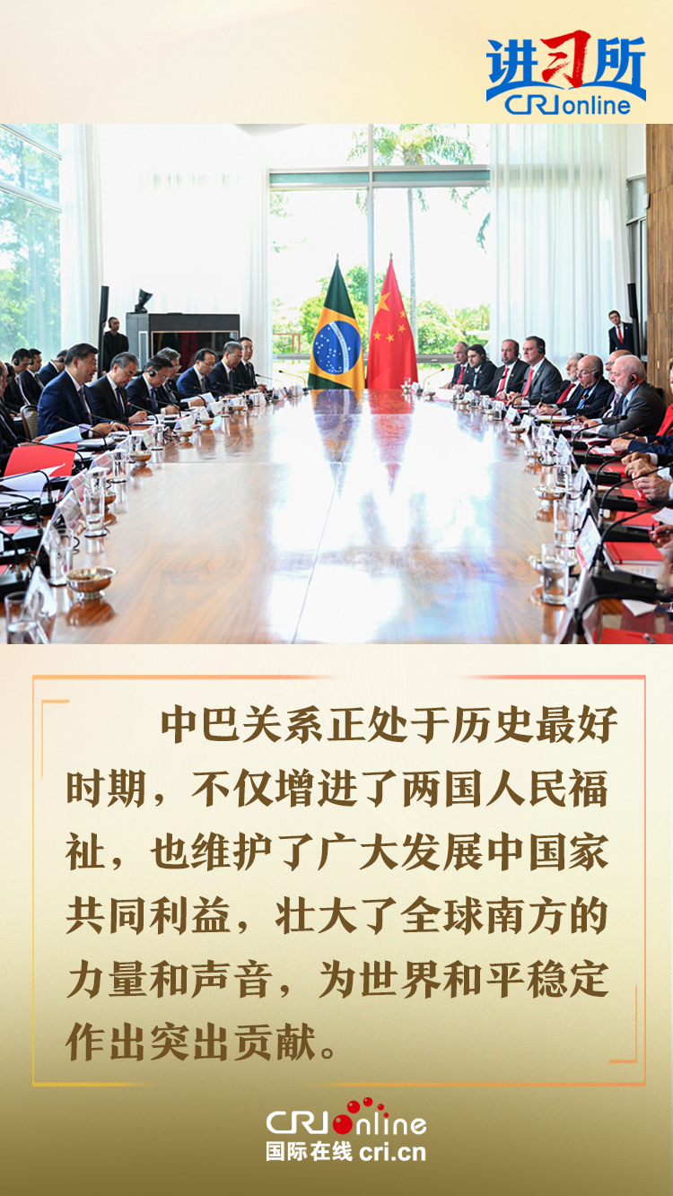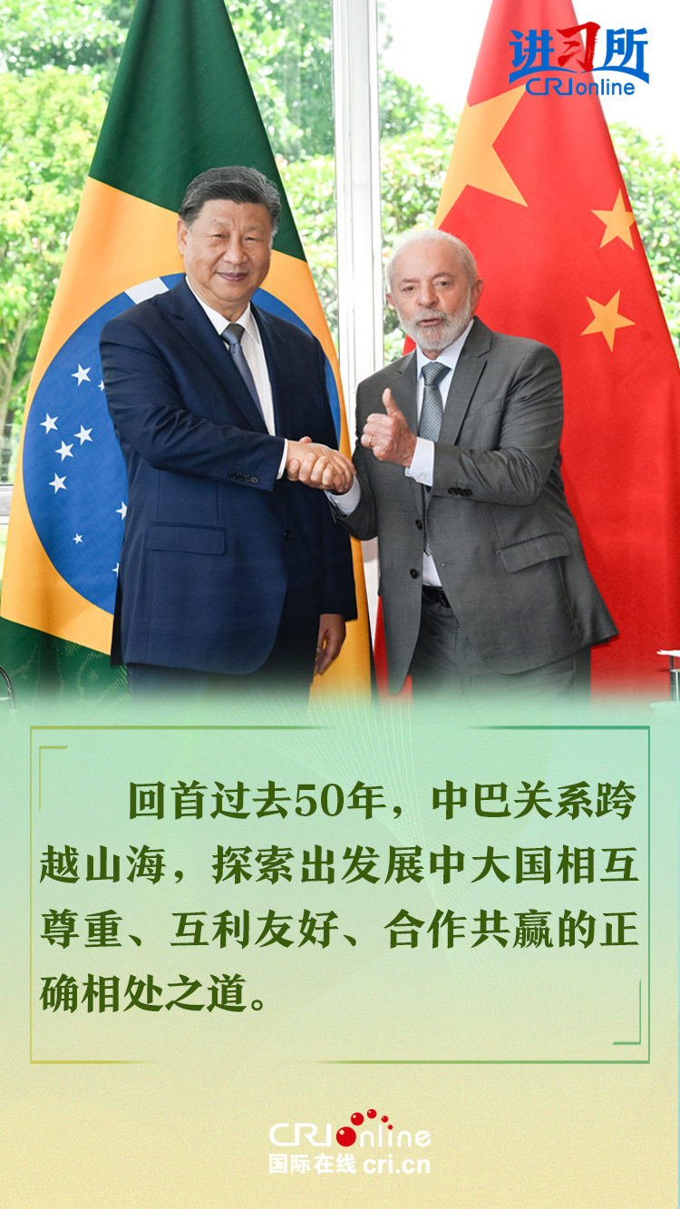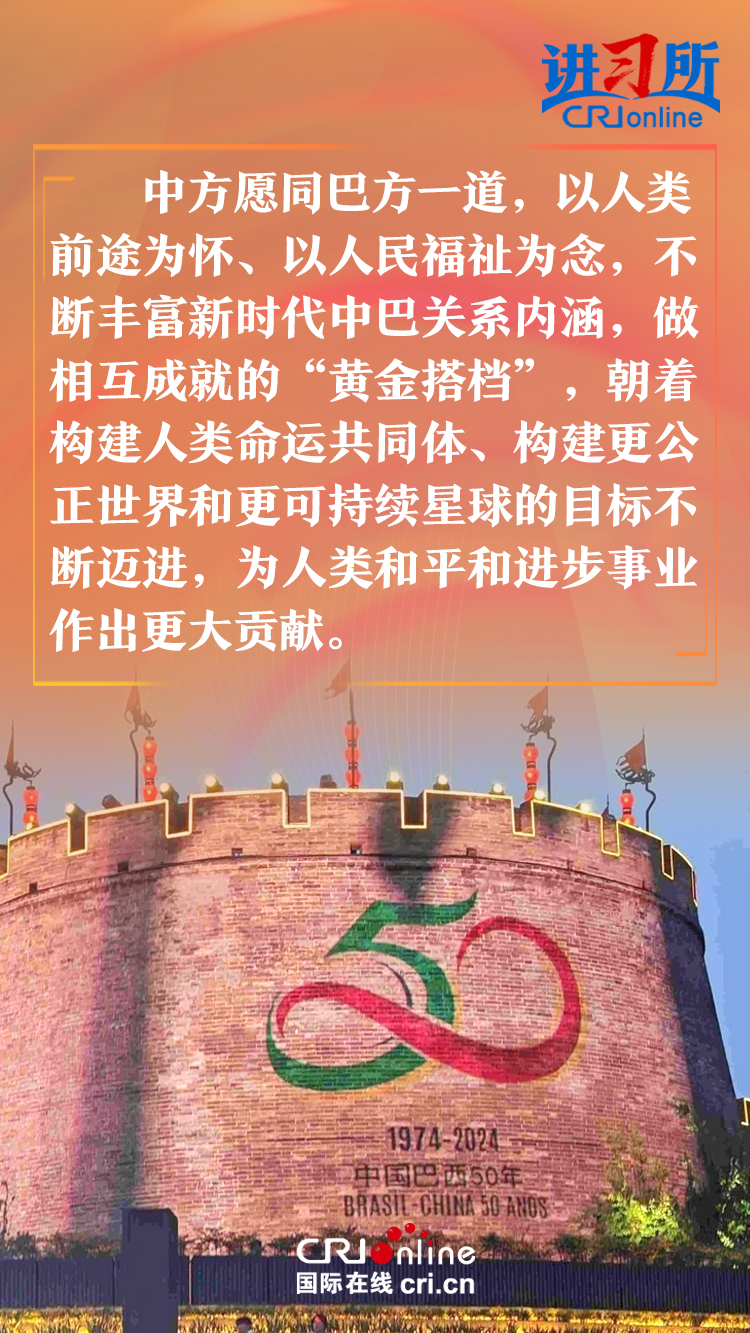 今年是中巴建交50周年。習(xí)近平指出,回首過(guò)去50年,中巴關(guān)系跨越山海,探索出發(fā)展中大國(guó)相互尊重、互利友好、合作共贏的正確相處之道。中方愿同巴方一道,以人類(lèi)前途為懷、以人民福祉為念,不斷豐富新時(shí)代中巴關(guān)系內(nèi)涵,做相互成就的“黃金搭檔”,朝著構(gòu)建人類(lèi)命運(yùn)共同體、構(gòu)建更公正世界和更可持續(xù)星球的目標(biāo)不斷邁進(jìn),為人類(lèi)和平和進(jìn)步事業(yè)作出更大貢獻(xiàn)。