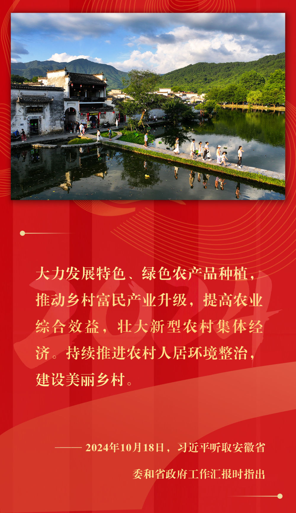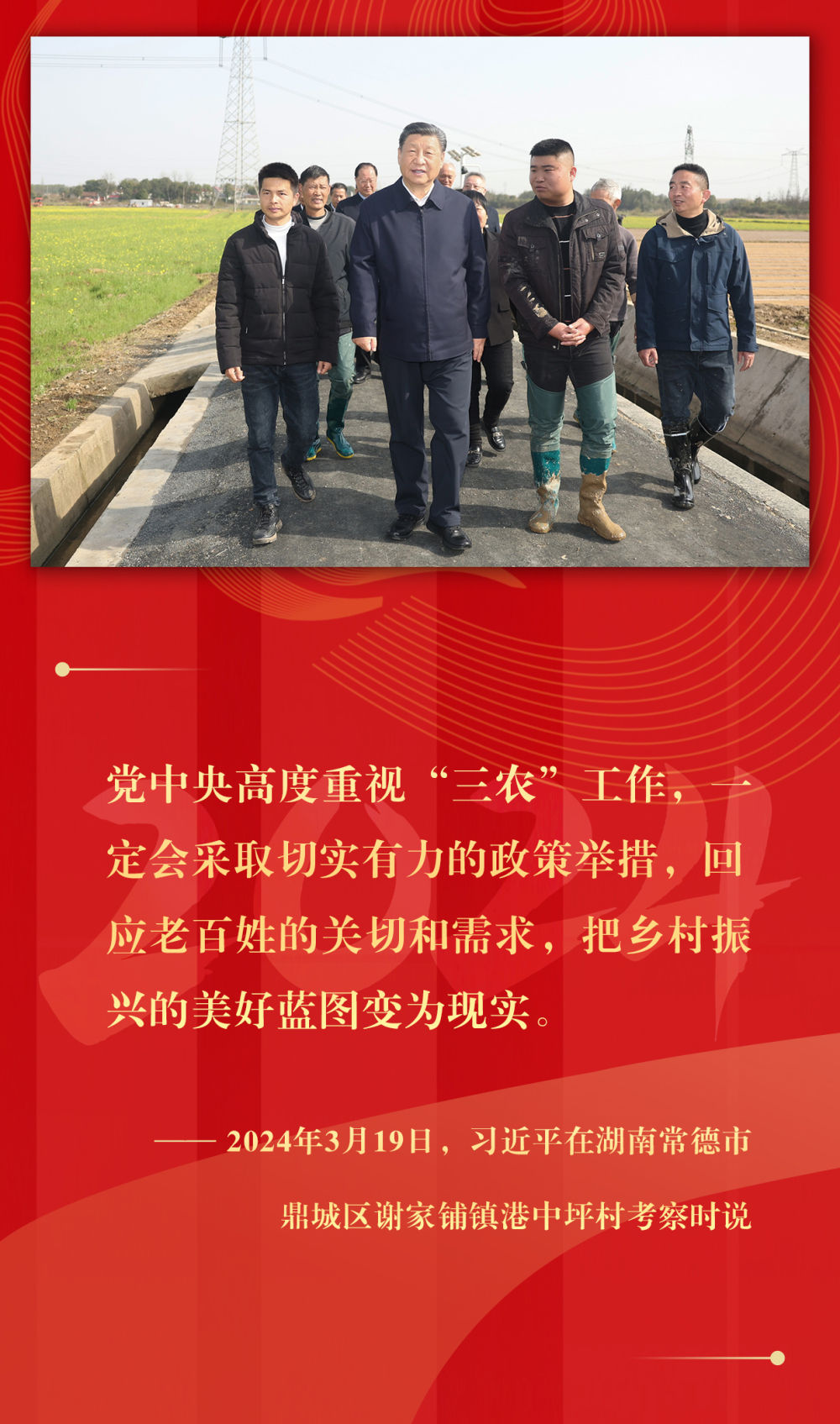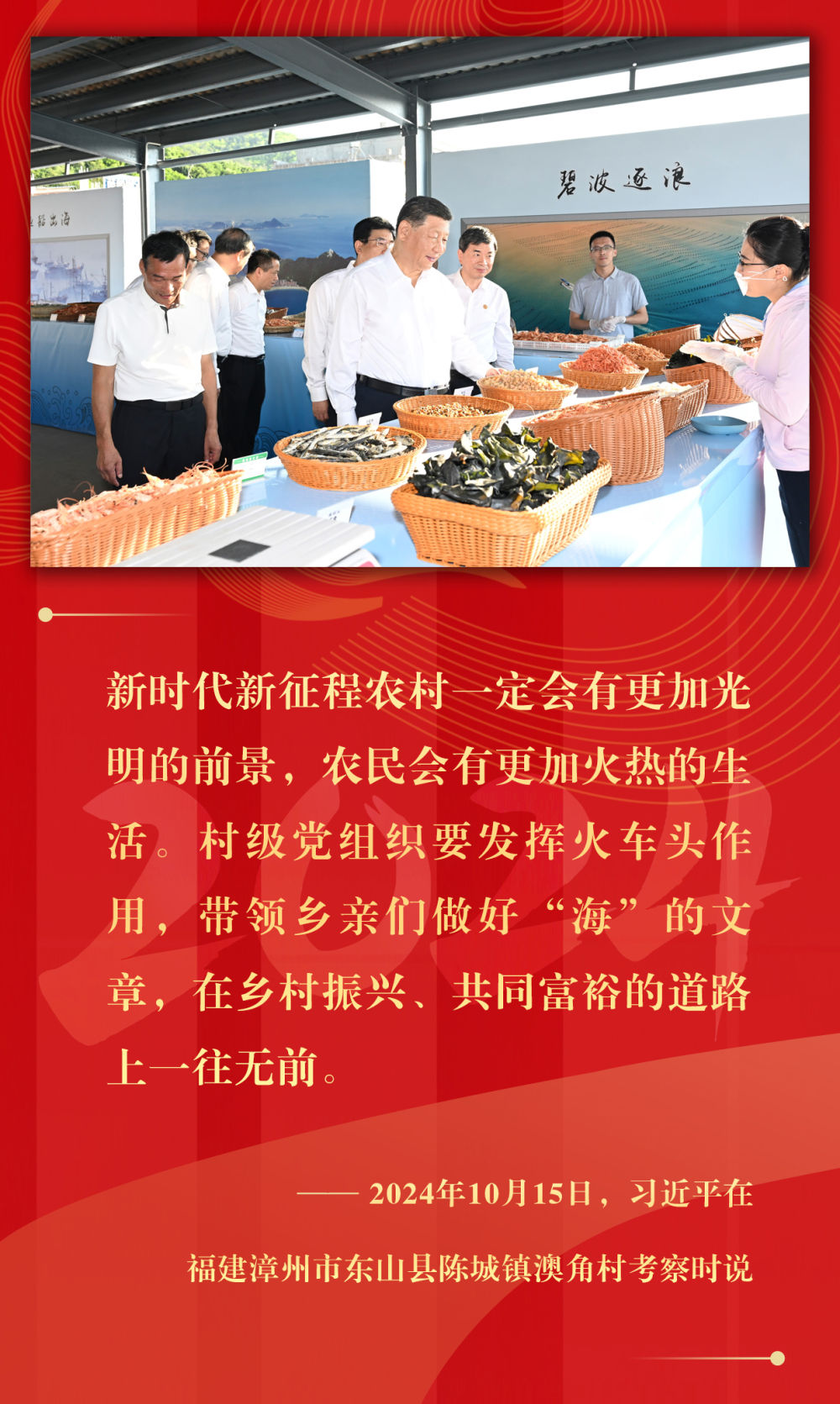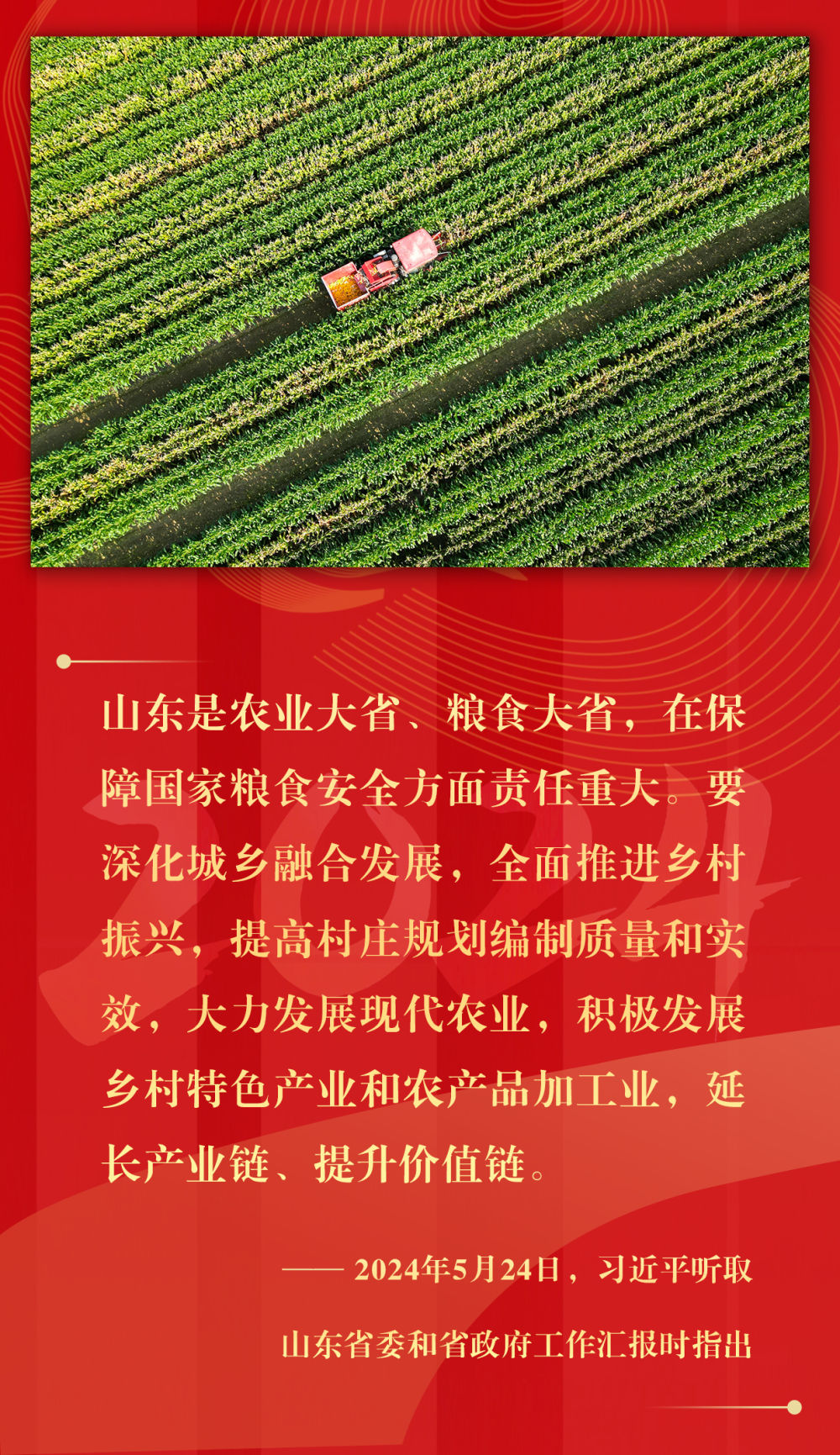 堅持城鄉(xiāng)融合發(fā)展、持續(xù)深化農(nóng)村改革、支持強農(nóng)惠農(nóng)富農(nóng)、拓寬農(nóng)民增收渠道、強化農(nóng)業(yè)科技和裝備支撐、確保糧食和重要農(nóng)產(chǎn)品穩(wěn)產(chǎn)保供……2024年,習近平總書記在基層考察期間,持續(xù)關(guān)注鄉(xiāng)村振興,多次提出重要指示,落子關(guān)鍵處、科學謀布局,千方百計推動農(nóng)業(yè)增效益、農(nóng)村增活力、農(nóng)民增收入。