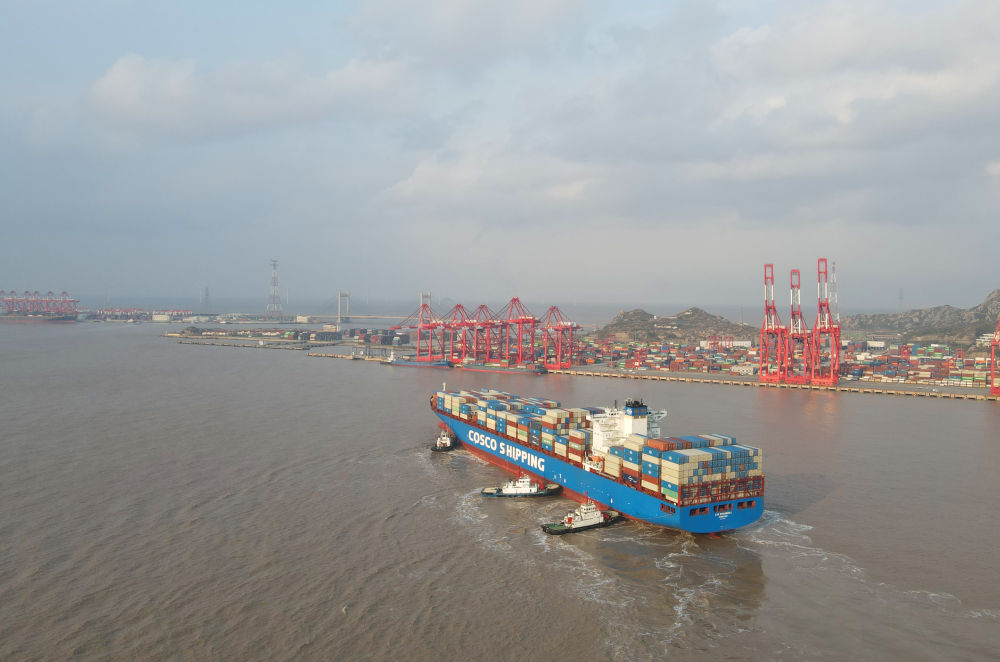 “新上?!陛喌诌_洋山港,這是自秘魯錢凱港開港后首個“錢凱—上?!闭胶酱危?024年12月18日攝,無人機照片)。新華社記者 方喆 攝