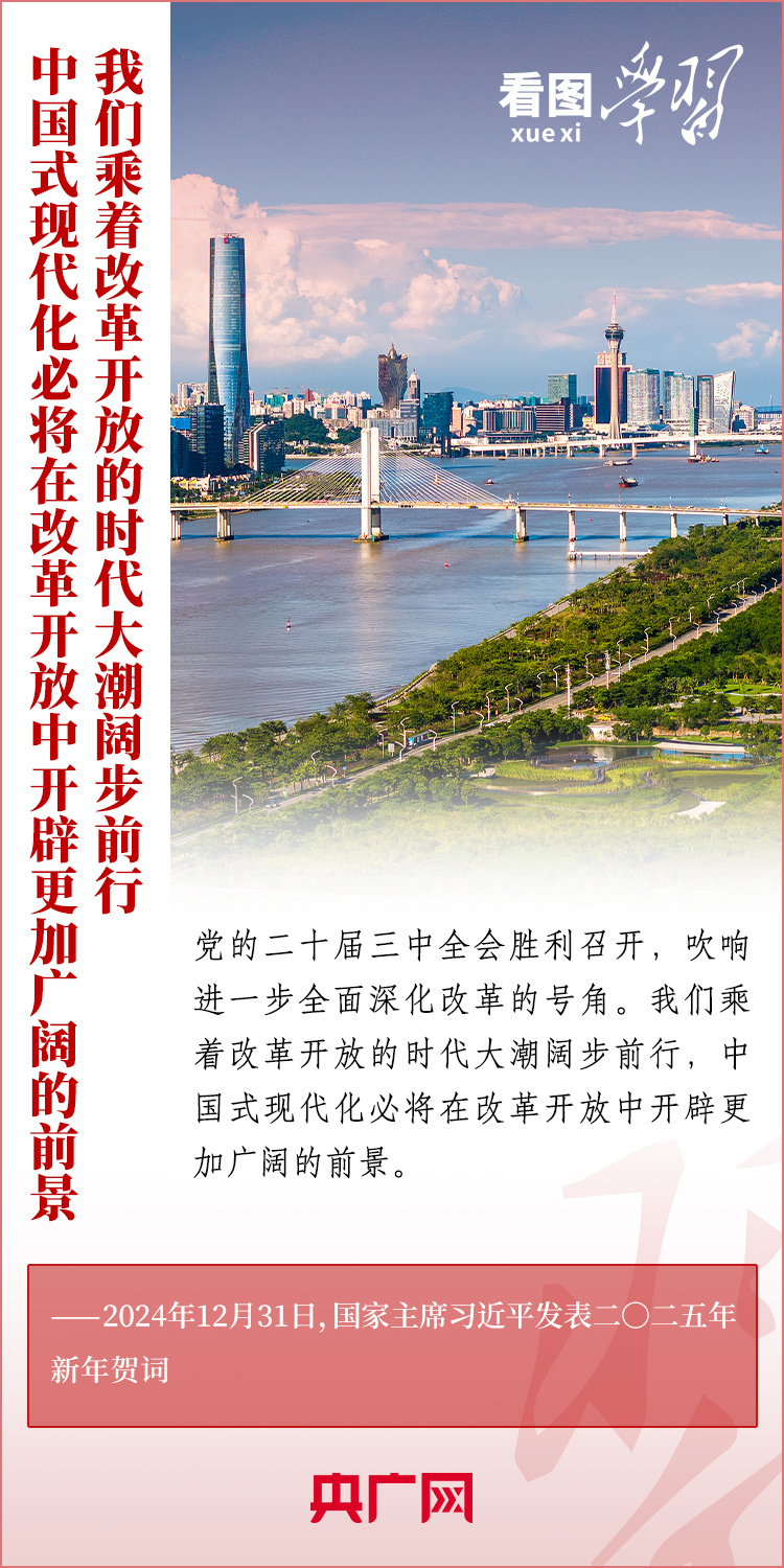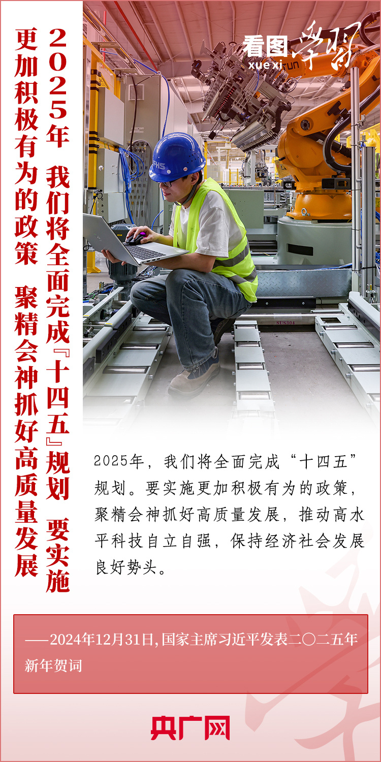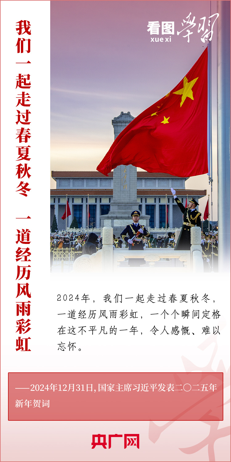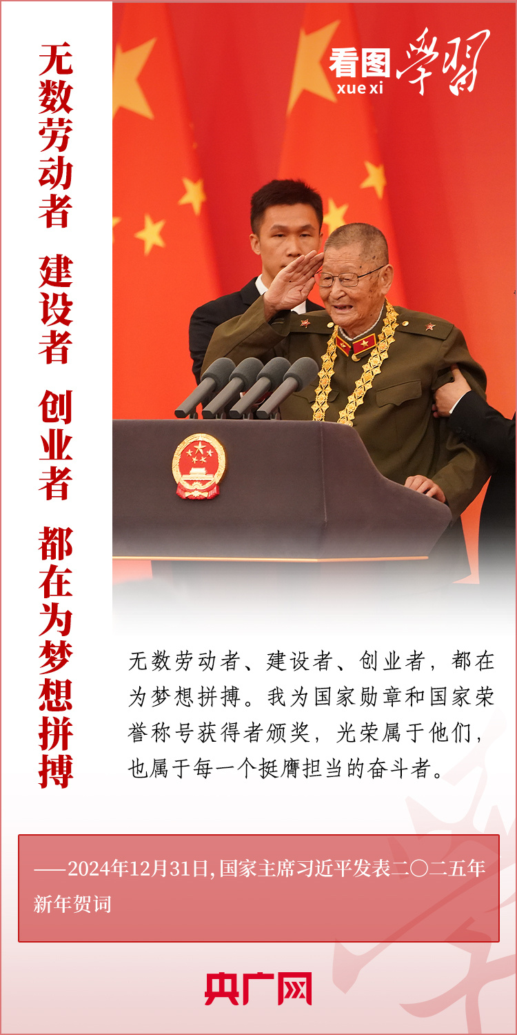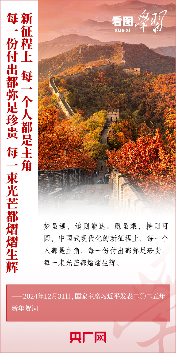 “夢雖遙,追則能達;愿雖艱,持則可圓。”新年前夕,習近平主席發(fā)表二〇二五年新年賀詞。在溫暖有力的講述中,習主席深情回望過去一年中國不平凡的奮斗歷程、精彩瞬間,感慨大家一道經(jīng)歷的風雨彩虹、難忘時刻,贊美無數(shù)為夢想拼搏的勞動者、建設者、創(chuàng)業(yè)者。習主席說,中國式現(xiàn)代化的新征程上,每一個人都是主角,每一份付出都彌足珍貴,每一束光芒都熠熠生輝。讓我們充滿信心,在新的一年接續(xù)奮斗!