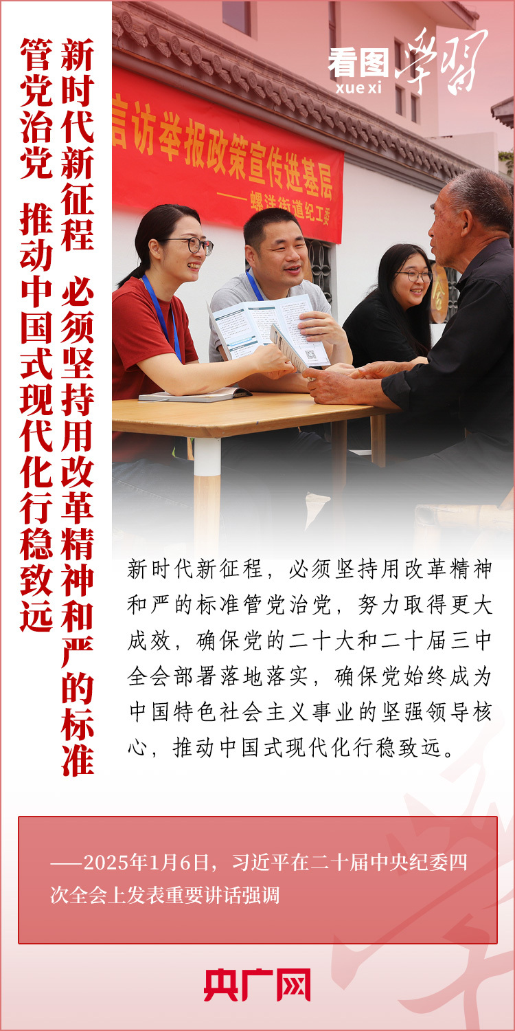 1月6日,習(xí)近平總書記在二十屆中央紀(jì)委四次全會(huì)上發(fā)表重要講話,充分肯定過去一年全面從嚴(yán)治黨取得的新進(jìn)展、新成效,深刻分析當(dāng)前反腐敗斗爭形勢,對(duì)堅(jiān)決打好反腐敗斗爭攻堅(jiān)戰(zhàn)、持久戰(zhàn)、總體戰(zhàn)提出明確要求??倳洀?qiáng)調(diào),新時(shí)代新征程,必須堅(jiān)持用改革精神和嚴(yán)的標(biāo)準(zhǔn)管黨治黨,努力取得更大成效,確保黨的二十大和二十屆三中全會(huì)部署落地落實(shí),確保黨始終成為中國特色社會(huì)主義事業(yè)的堅(jiān)強(qiáng)領(lǐng)導(dǎo)核心,推動(dòng)中國式現(xiàn)代化行穩(wěn)致遠(yuǎn)。一起來學(xué)習(xí)!