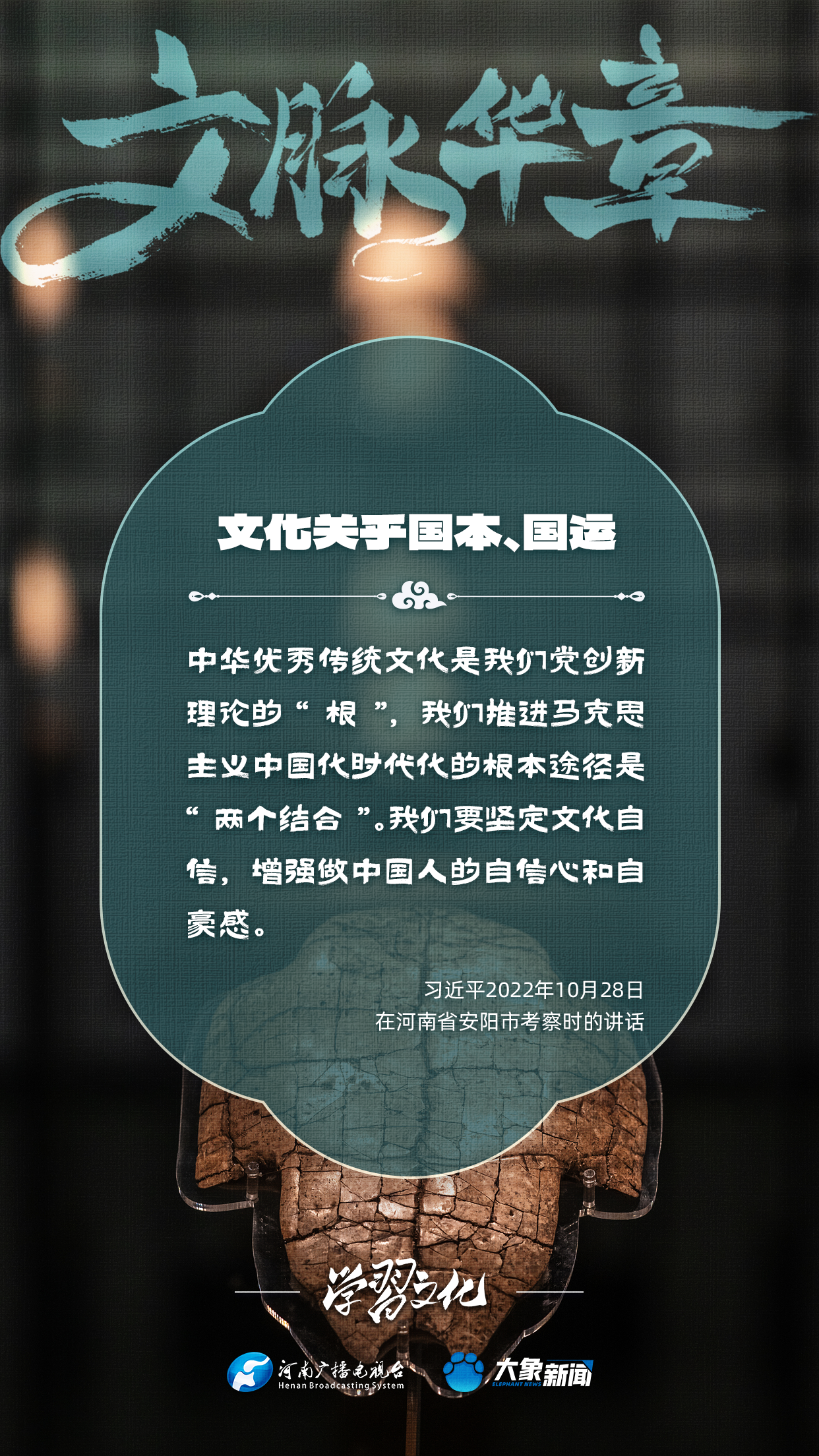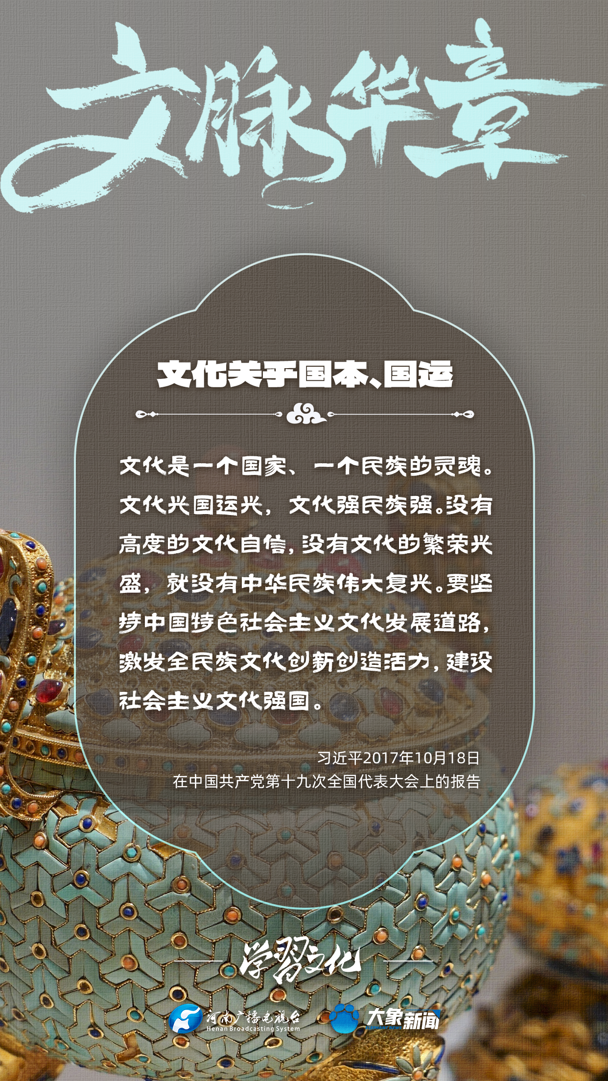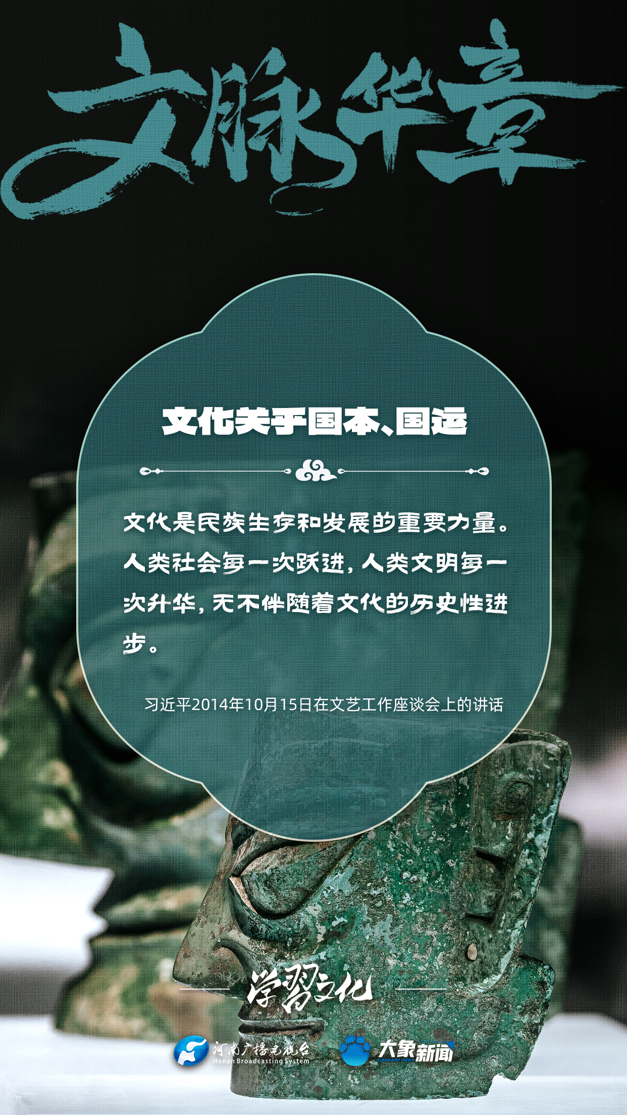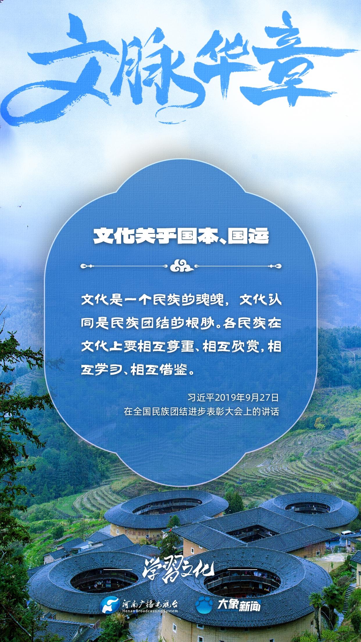 習近平總書記高度重視文化之于國家、之于民族的重大意義,強調:文化是一個國家、一個民族的靈魂。文化興國運興,文化強民族強。沒有高度的文化自信,沒有文化的繁榮興盛,就沒有中華民族偉大復興。大象新聞梳理了習近平總書記的系列重要論述,我們一起學習。