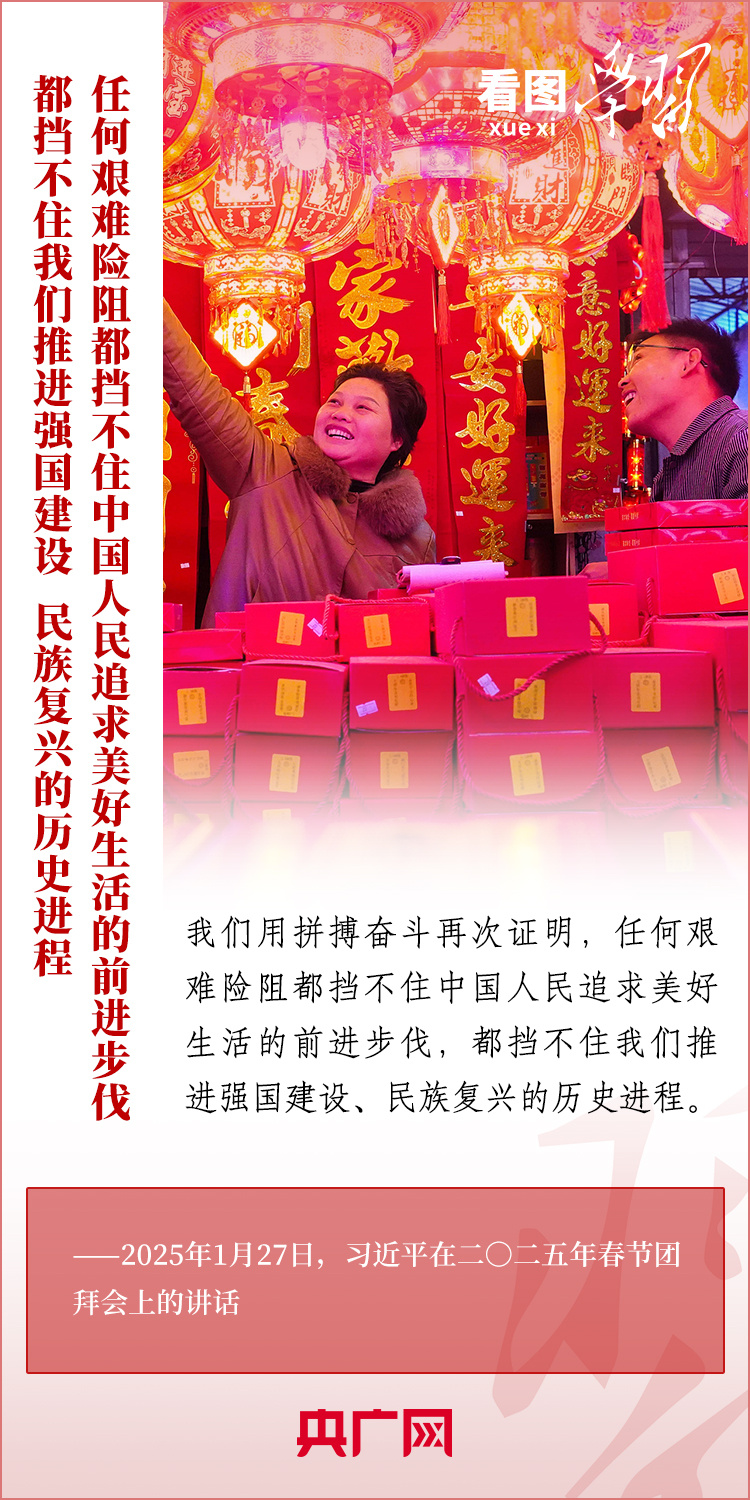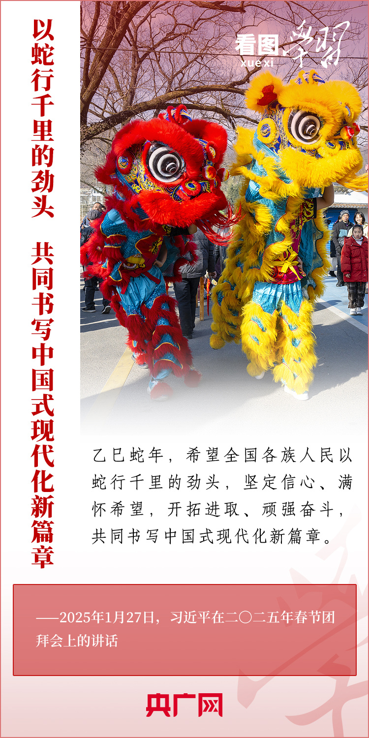 1月27日,中共中央、國(guó)務(wù)院在北京舉行春節(jié)團(tuán)拜會(huì),習(xí)近平總書記發(fā)表熱情洋溢的講話,向全國(guó)各族人民、港澳臺(tái)同胞、海外僑胞拜年并致以新春祝福??倳浽谥v話中深情回顧過去一年中國(guó)式現(xiàn)代化取得很不平凡的發(fā)展歷程,“希望全國(guó)各族人民以蛇行千里的勁頭,堅(jiān)定信心、滿懷希望,開拓進(jìn)取、頑強(qiáng)奮斗,共同書寫中國(guó)式現(xiàn)代化新篇章?!币黄饋韺W(xué)習(xí)!