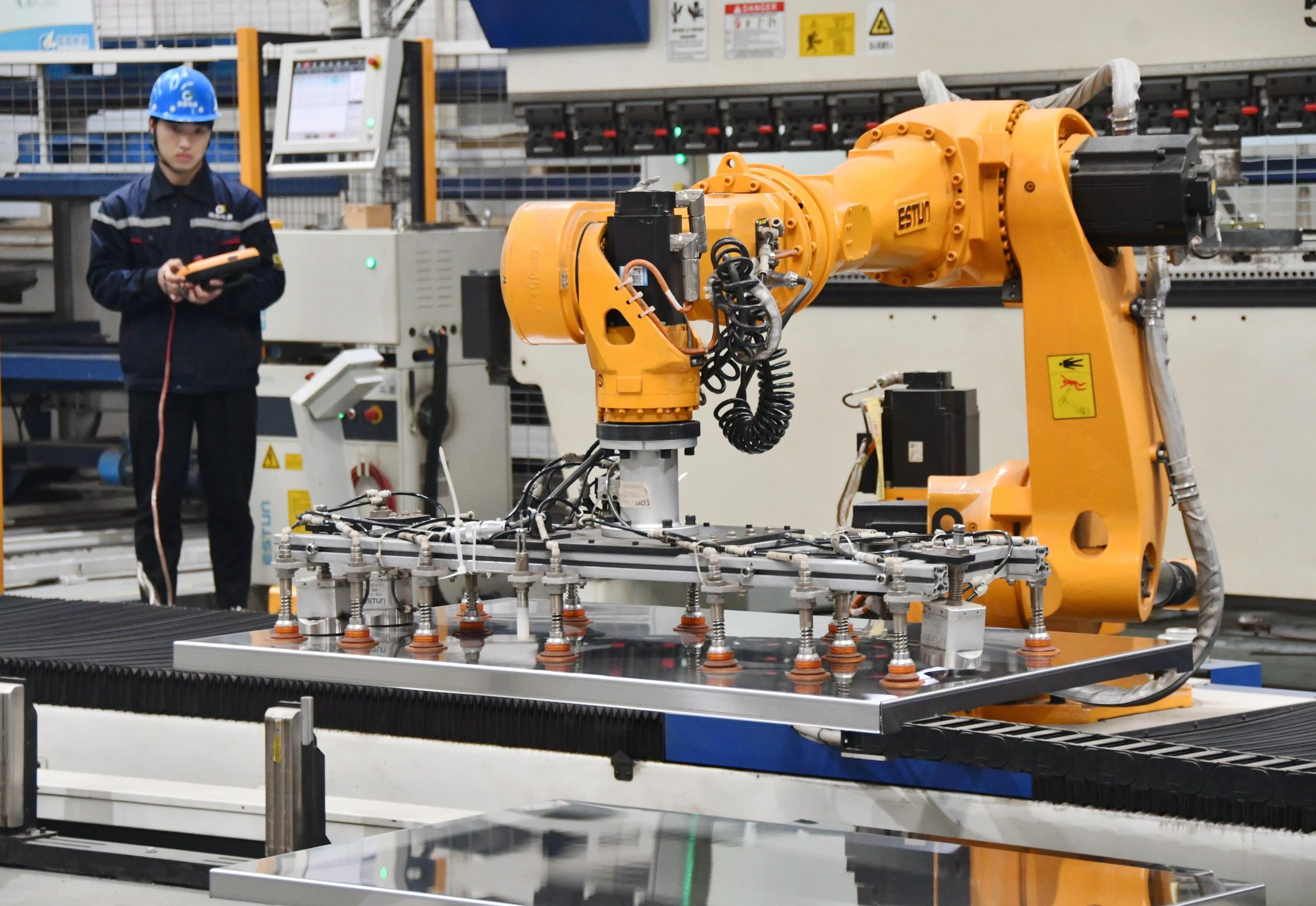 2025年2月21日,河北邯鄲永年區(qū)工業(yè)園區(qū)的一家企業(yè),工人正在操控工業(yè)機器人作業(yè)。