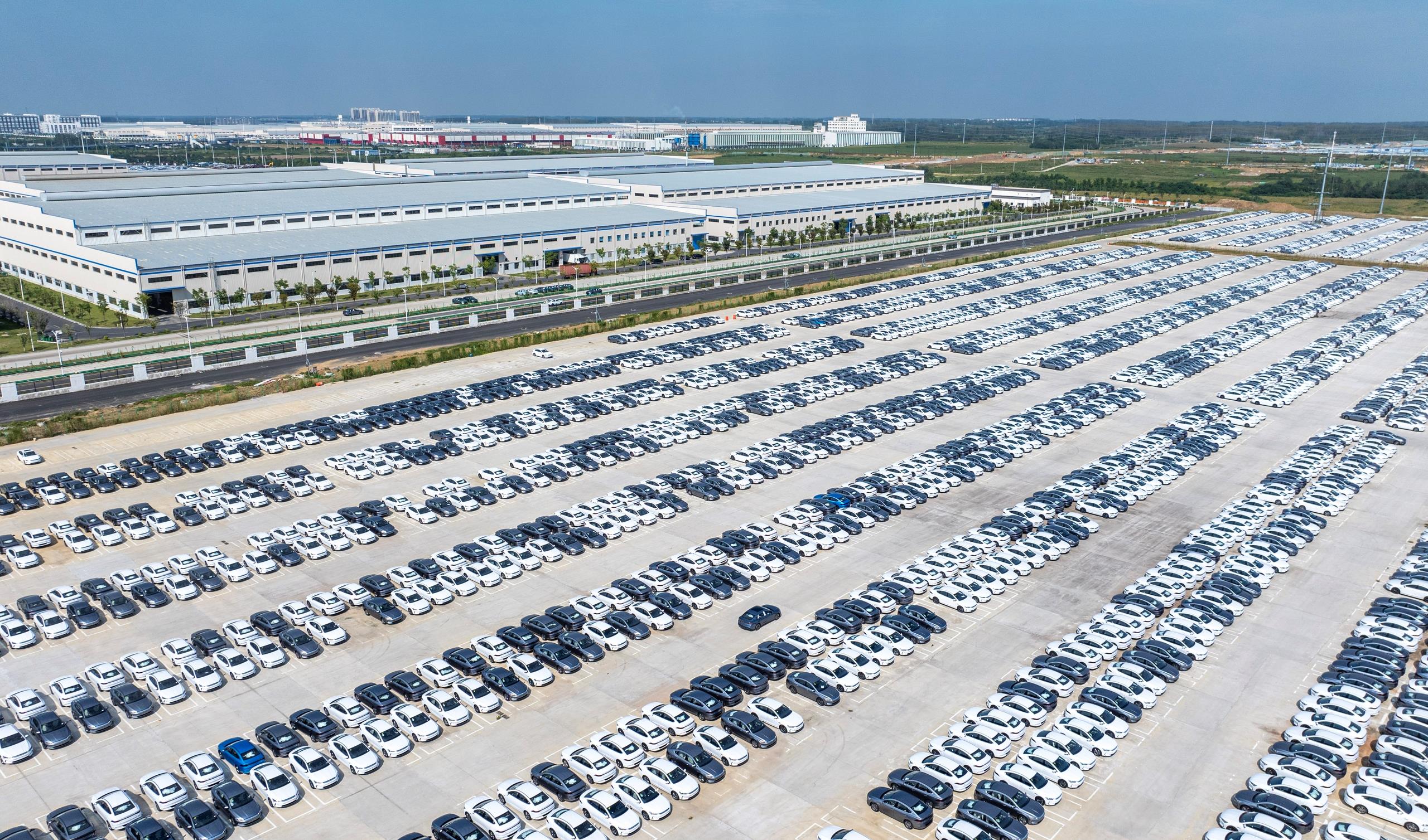 2024年9月,安徽合肥,整齊停放的新能源汽車正在等待裝車銷往國(guó)內(nèi)外市場(chǎng)。