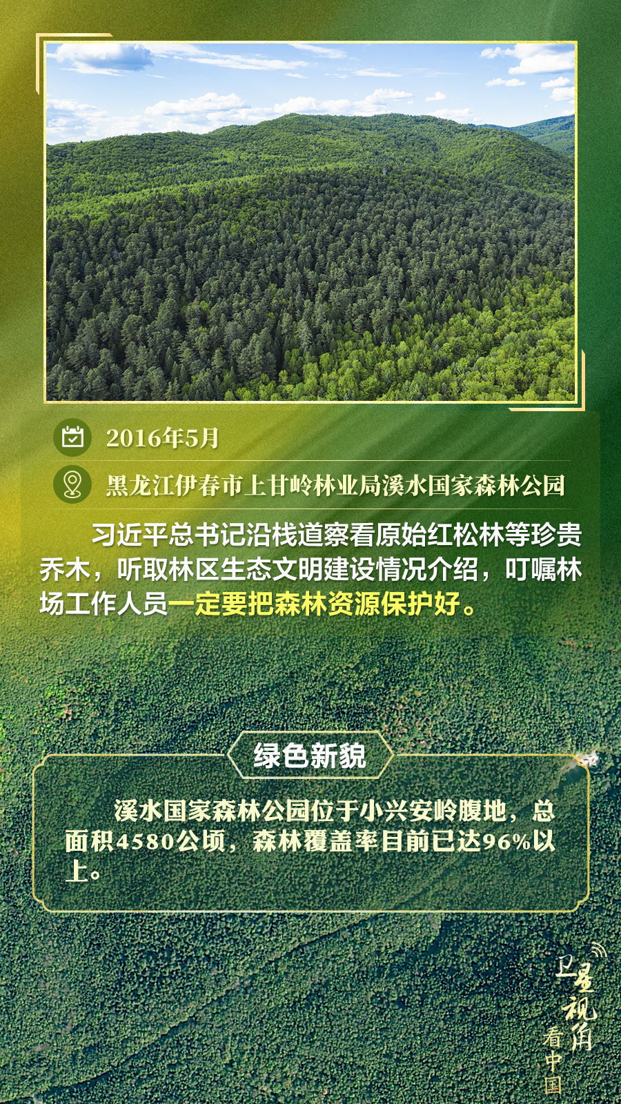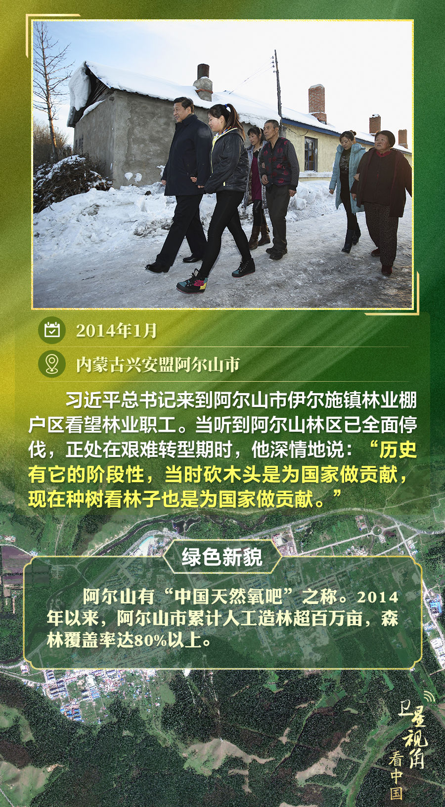 通過衛(wèi)星視角,一起俯瞰總書記去過的這些林區(qū),重溫總書記對造林護林的殷殷囑托,感受綠色新貌。