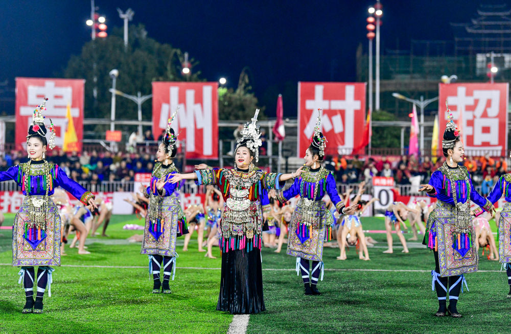 2025年3月14日,2025年貴州“村超”40強(qiáng)交叉賽在榕江“村超”足球場舉行,演員在比賽間隙表演侗族大歌,民族文化伴隨著體育賽事成功“出圈”。
