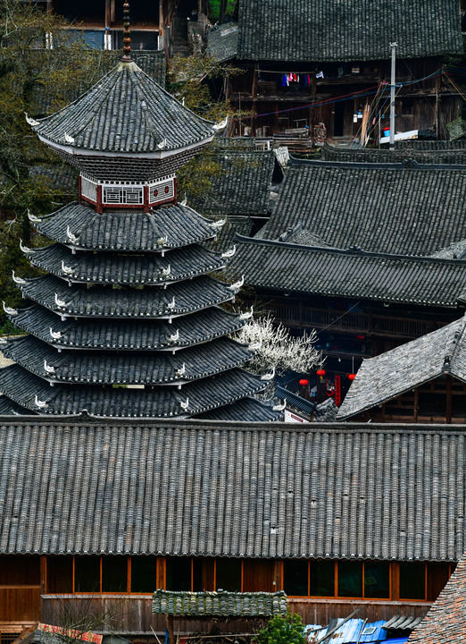 2024年3月17日拍攝的貴州省榕江縣栽麻鎮(zhèn)大利侗寨鼓樓。鼓樓是侗族的文化符號之一,每個侗寨至少有一座,是侗族人民集中議事、評斷是非的公共場所,也是侗家人出生和去世時必須要停留的場地。