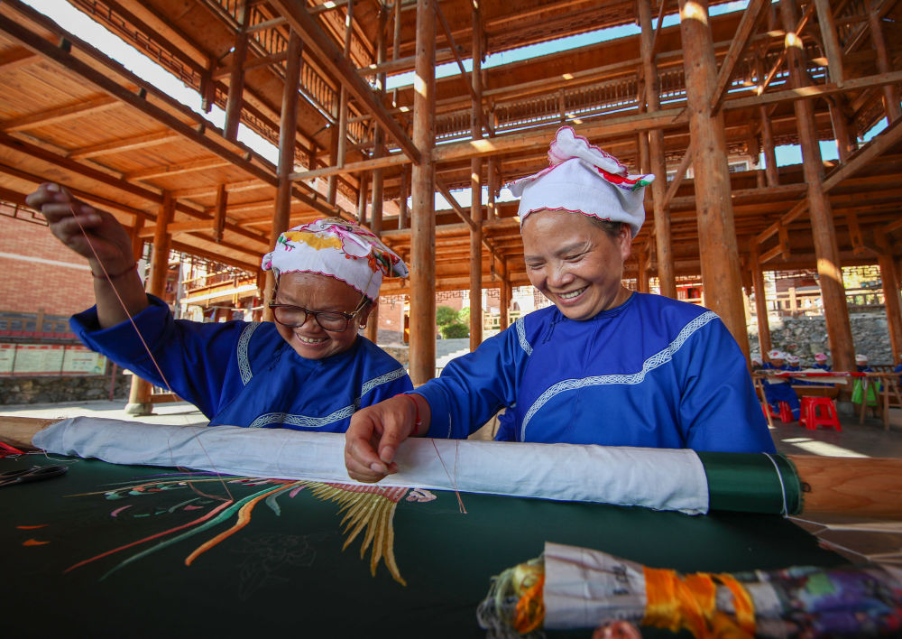 2021年9月27日,貴州省鎮(zhèn)遠(yuǎn)縣報京鄉(xiāng)報京村村民邰木香(右)在制作侗繡。邰木香將侗族的民間故事以刺繡形式展現(xiàn)出來,還先后開發(fā)出傳統(tǒng)與現(xiàn)代相結(jié)合的侗族服飾、工藝包、繡花鞋、圍腰、頭巾、枕巾等系列產(chǎn)品,深受國內(nèi)外客商的青睞,致富的同時帶動當(dāng)?shù)?00多名繡娘實現(xiàn)就業(yè)增收。