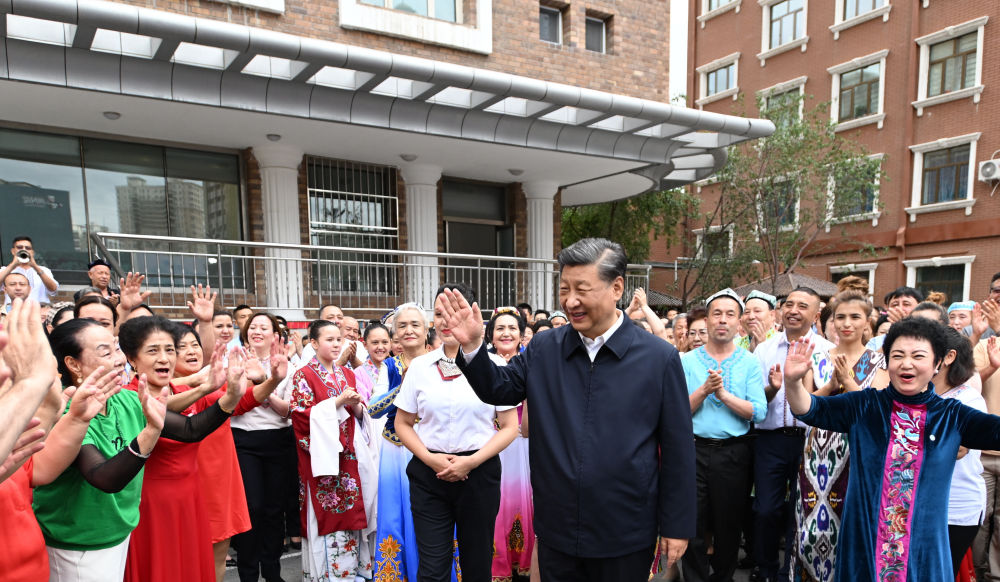 2022年7月13日上午,習(xí)近平在新疆烏魯木齊市天山區(qū)固原巷社區(qū)考察時,身著民族服裝的各族群眾簇?fù)碓诳倳浬磉?,載歌載舞,向總書記表達(dá)由衷的愛戴。