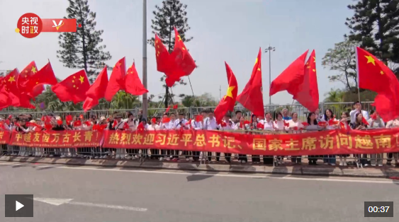 習(xí)近平乘車從機場赴下榻飯店途中,中越兩黨兩國旗幟迎風(fēng)飄揚,“中越友誼萬古長青”、“山水相連,命運與共”、“中越情誼深,同志加兄弟”等紅色橫幅鮮艷奪目。當(dāng)?shù)孛癖姾椭匈Y機構(gòu)、留學(xué)生代表聚集在道路兩旁,熱烈歡迎習(xí)近平到訪。