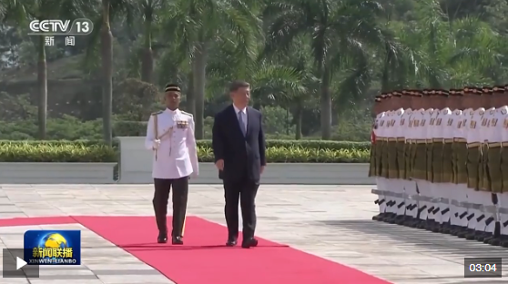 習(xí)近平乘車(chē)抵達(dá)時(shí),易卜拉欣和馬來(lái)西亞總理安瓦爾在下車(chē)處熱情迎接。兩國(guó)元首登上檢閱臺(tái),軍樂(lè)團(tuán)奏中馬兩國(guó)國(guó)歌,鳴禮炮21響。習(xí)近平檢閱儀仗隊(duì)。兩國(guó)元首進(jìn)入國(guó)家王宮大廳,同雙方陪同人員握手致意。