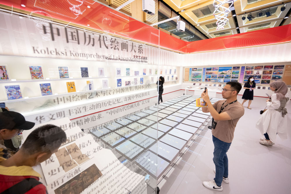 2023年5月26日,觀眾在馬來西亞吉隆坡舉行的第40屆吉隆坡國際書展上觀看“中國歷代繪畫大系”展覽。由浙江大學、浙江省文物局編纂,浙江大學出版社出版的“中國歷代繪畫大系”,收錄了海內(nèi)外263家文博機構的紙、絹(含帛、綾)、麻等材質(zhì)的中國古代繪畫藏品12000余件(套),涵蓋了絕大部分傳世的“國寶”級繪畫珍品。