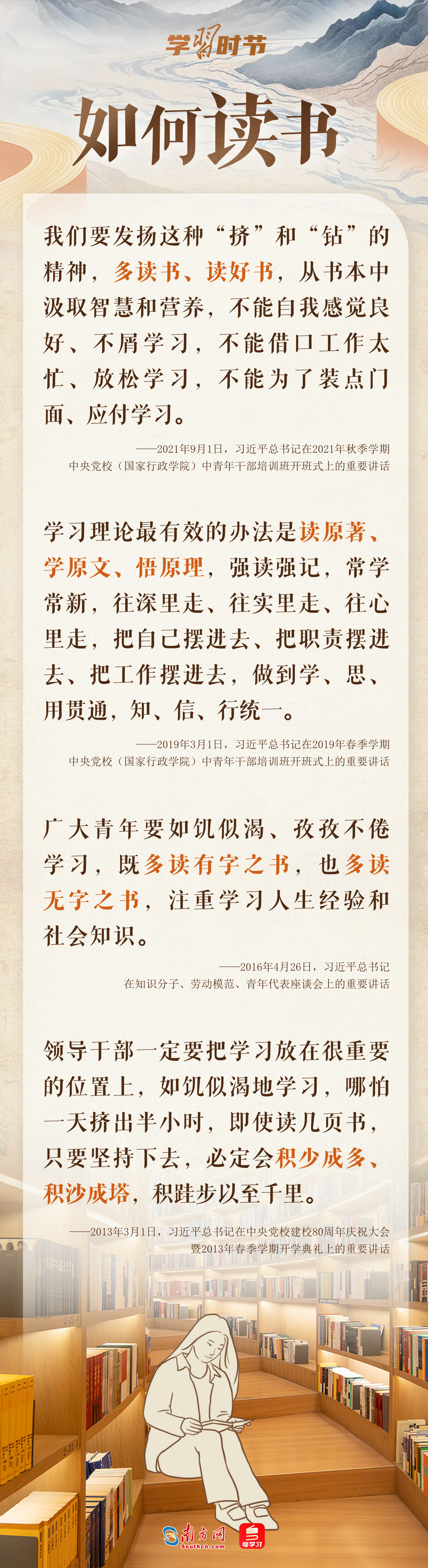 4月23日是第30個(gè)世界讀書(shū)日。我們?yōu)楹我x書(shū)?應(yīng)如何讀書(shū)?讀些什么書(shū)?讓我們跟隨總書(shū)記的“讀書(shū)指南”,一起“愛(ài)讀書(shū)、讀好書(shū)、善讀書(shū)”。