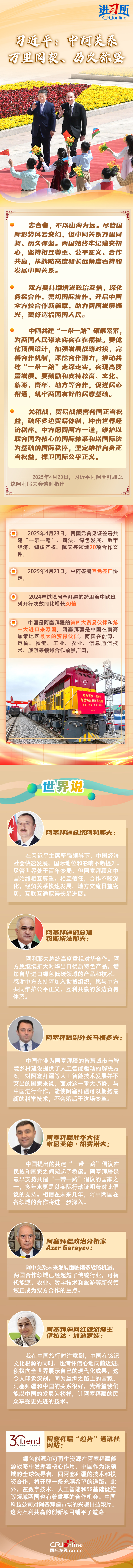 4月23日,中國國家主席習(xí)近平在北京同阿塞拜疆總統(tǒng)阿利耶夫舉行會(huì)談。兩國元首宣布,建立中阿全面戰(zhàn)略伙伴關(guān)系。習(xí)近平指出,盡管國際形勢風(fēng)云變幻,但中阿關(guān)系萬里同契、歷久彌堅(jiān)。雙方要持續(xù)增進(jìn)政治互信,深化務(wù)實(shí)合作,密切國際協(xié)作,開啟中阿全方位合作新篇章,助力兩國發(fā)展振興,更好造福兩國人民。