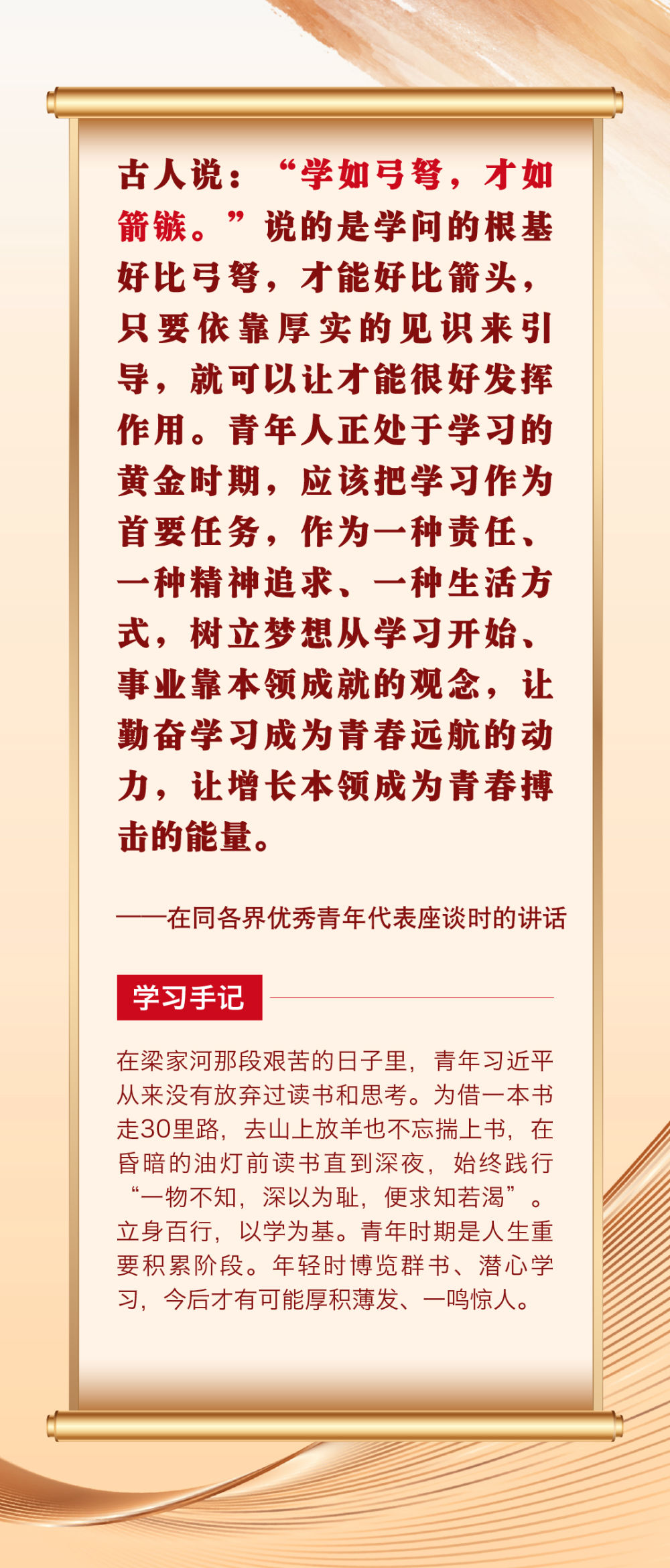 “青年者,國家之魂?!鼻嗄暌淮院畏N精神風貌站上時代舞臺,關乎祖國的明天、民族的未來。黨的十八大以來,習近平總書記圍繞青年成長成才作出許多重要論述。其中,有信手拈來的精妙典故,有貫古通今的廣征博引,引領廣大青年不斷在中華文化的浸潤中堅定中國心、涵養(yǎng)民族魂,成長為堪當復興重任的時代新人。