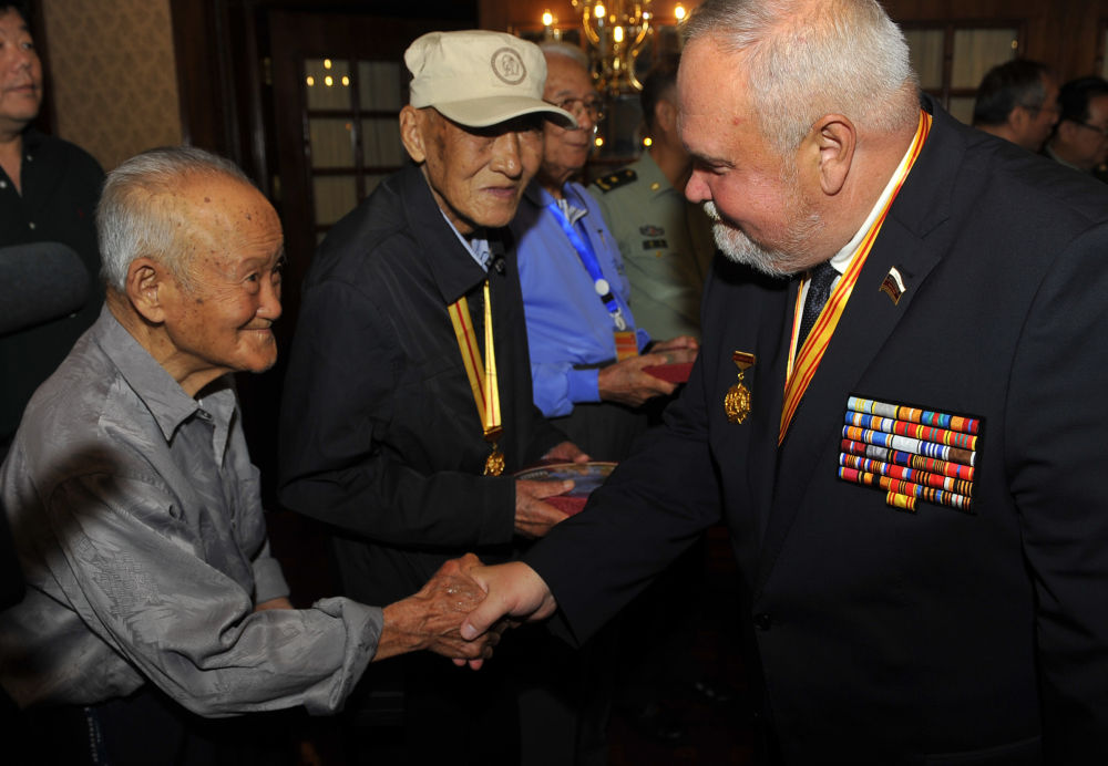 2015年9月5日,二戰(zhàn)蘇軍著名統(tǒng)帥瓦西里·崔可夫的外孫尼古拉·崔可夫(前右)與中國抗戰(zhàn)老兵代表在活動現(xiàn)場交流。新華社記者 魯鵬 攝