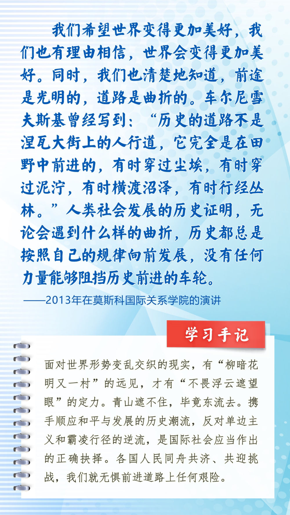 我們一起來(lái)學(xué)習(xí)品讀這些飽含哲思的論述,從中感悟新時(shí)代中俄關(guān)系在復(fù)雜的外部環(huán)境下堅(jiān)毅前行之道,感悟習(xí)近平主席作為大黨大國(guó)領(lǐng)袖、世界級(jí)領(lǐng)袖的時(shí)代擔(dān)當(dāng)與天下情懷。