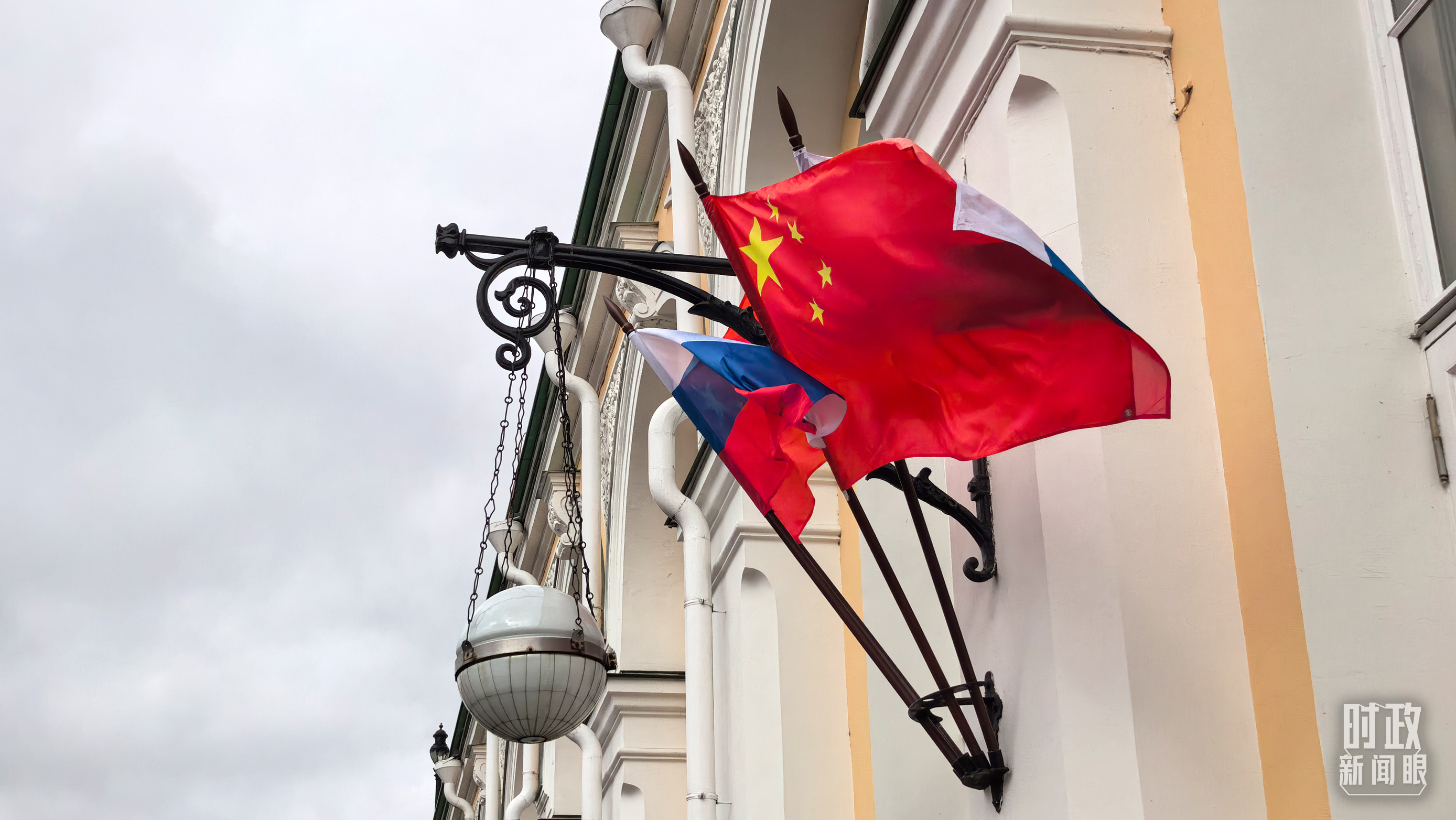 下車(chē)處懸掛的中俄兩國(guó)國(guó)旗。(總臺(tái)央視記者劉琦拍攝)