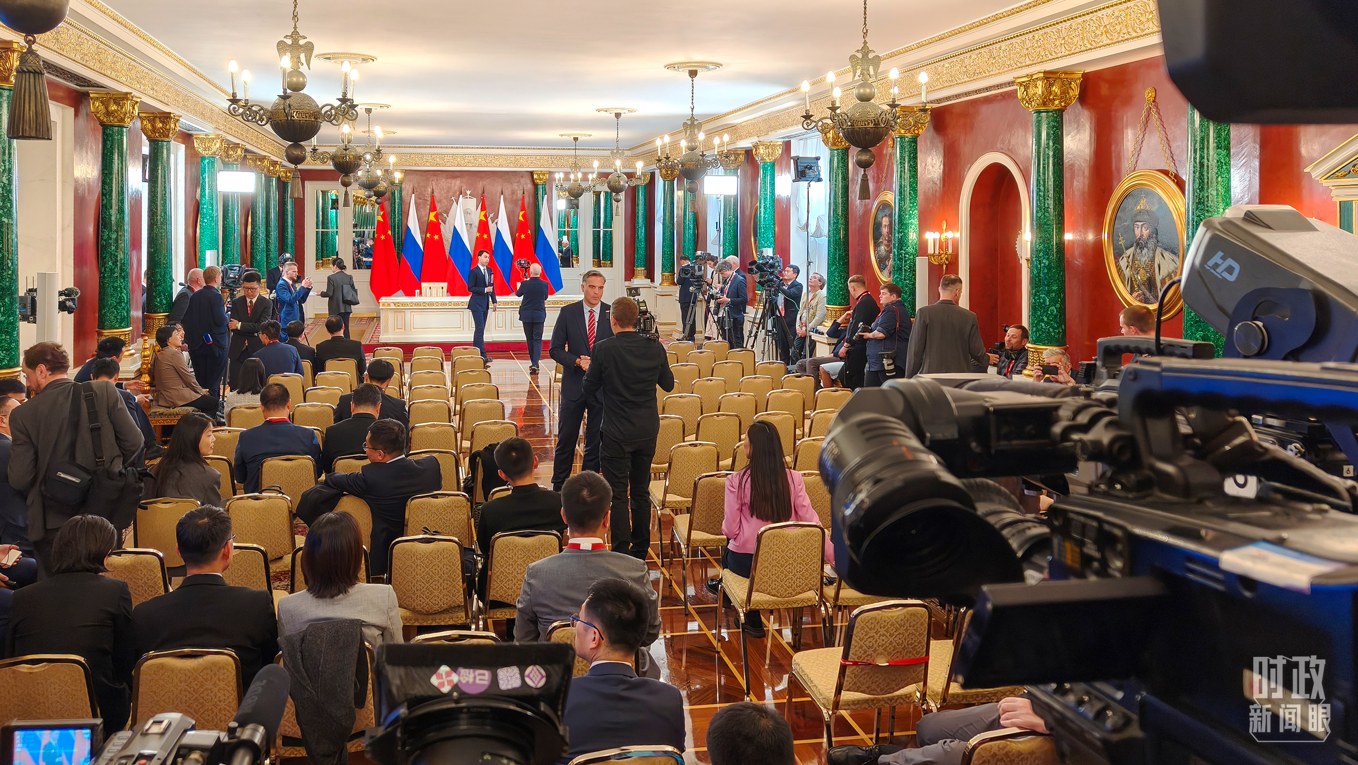 等待中俄兩國(guó)元首共見(jiàn)記者的中外媒體同仁。(總臺(tái)央視記者陸泓宇、蔣碩拍攝)