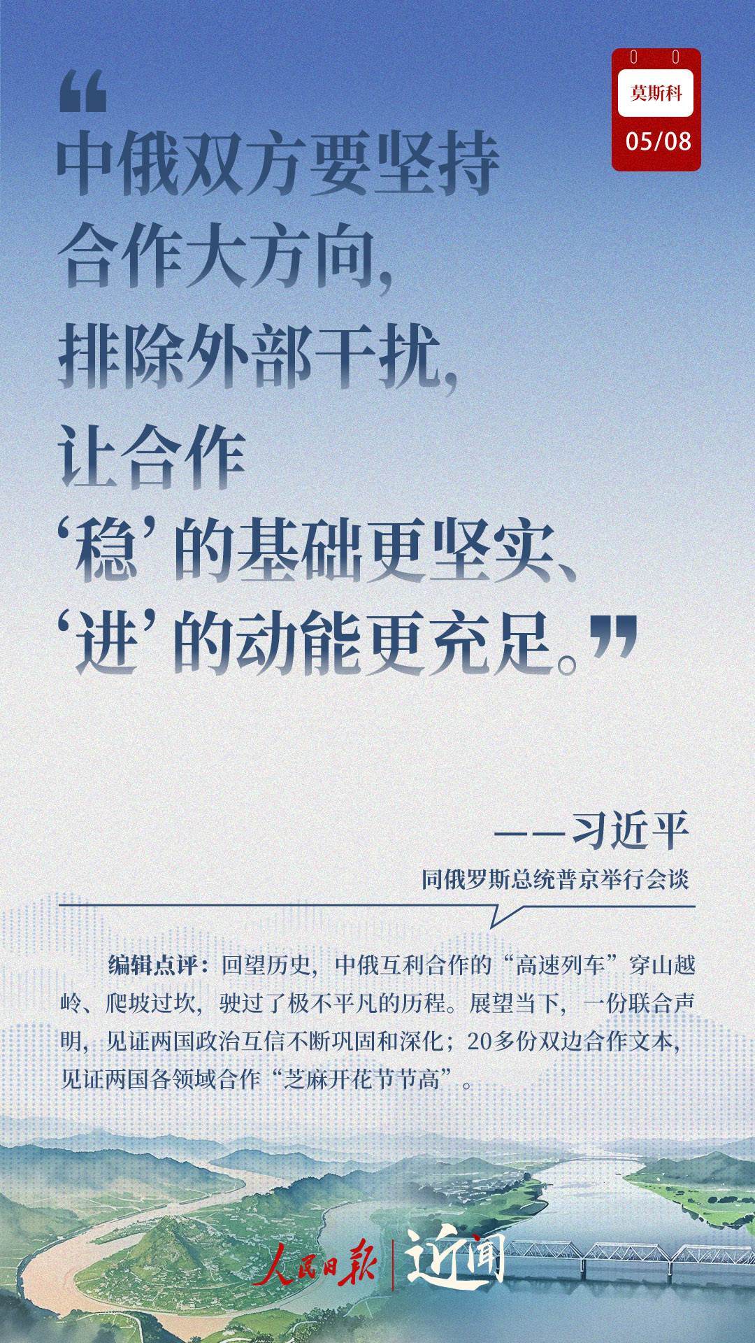 當(dāng)?shù)貢r(shí)間5月8日,習(xí)近平主席出席普京總統(tǒng)舉行的歡迎儀式、小范圍會(huì)談、大范圍會(huì)談、簽字和合作文本交換儀式、共見(jiàn)記者、茶敘,兩國(guó)元首不同形式的長(zhǎng)時(shí)間交流,引領(lǐng)中俄關(guān)系登高望遠(yuǎn)。