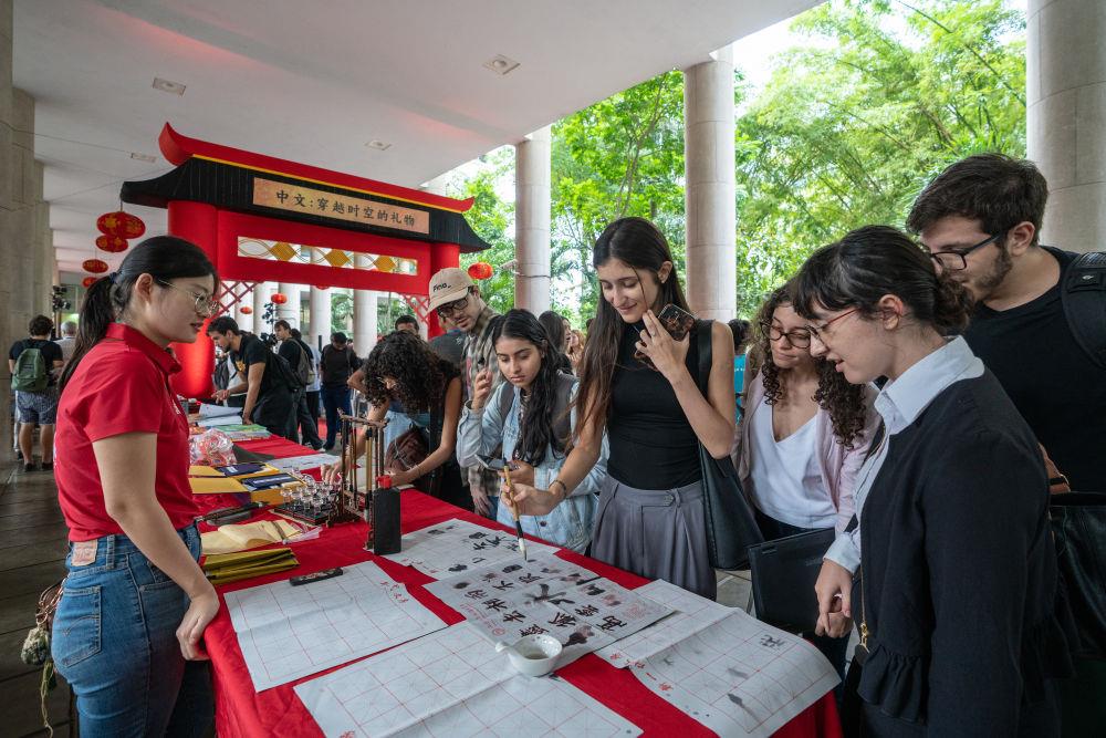 2025年4月,在巴西里約熱內(nèi)盧天主教大學(xué)舉辦的“國際中文日”慶祝活動(dòng)上,學(xué)生們體驗(yàn)中文書法。