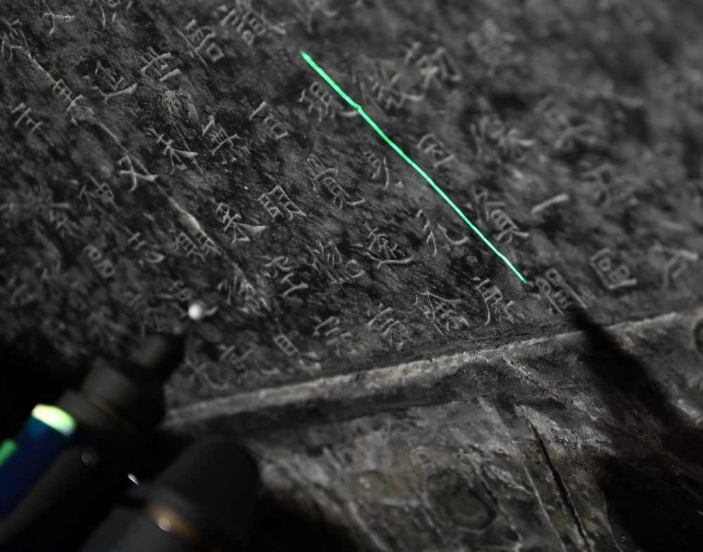 2025年4月9日,龍門(mén)石窟研究院工作人員在古陽(yáng)洞使用關(guān)節(jié)臂掃描儀對(duì)《龍門(mén)二十品》之一進(jìn)行數(shù)字化掃描。新華社記者 李嘉南 攝