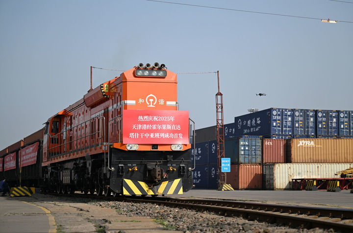 2025年5月20日,2025年首列天津港經(jīng)霍爾果斯直達(dá)塔什干的中亞班列從天津港物捷三堆場(chǎng)發(fā)車。新華社記者 趙子碩 攝