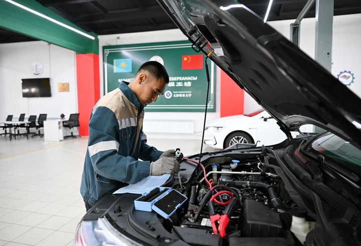 2025年5月9日,在哈薩克斯坦東哈薩克斯坦州首府厄斯克門(mén)的魯班工坊,學(xué)員練習(xí)汽車檢修技能。新華社記者 李任滋 攝