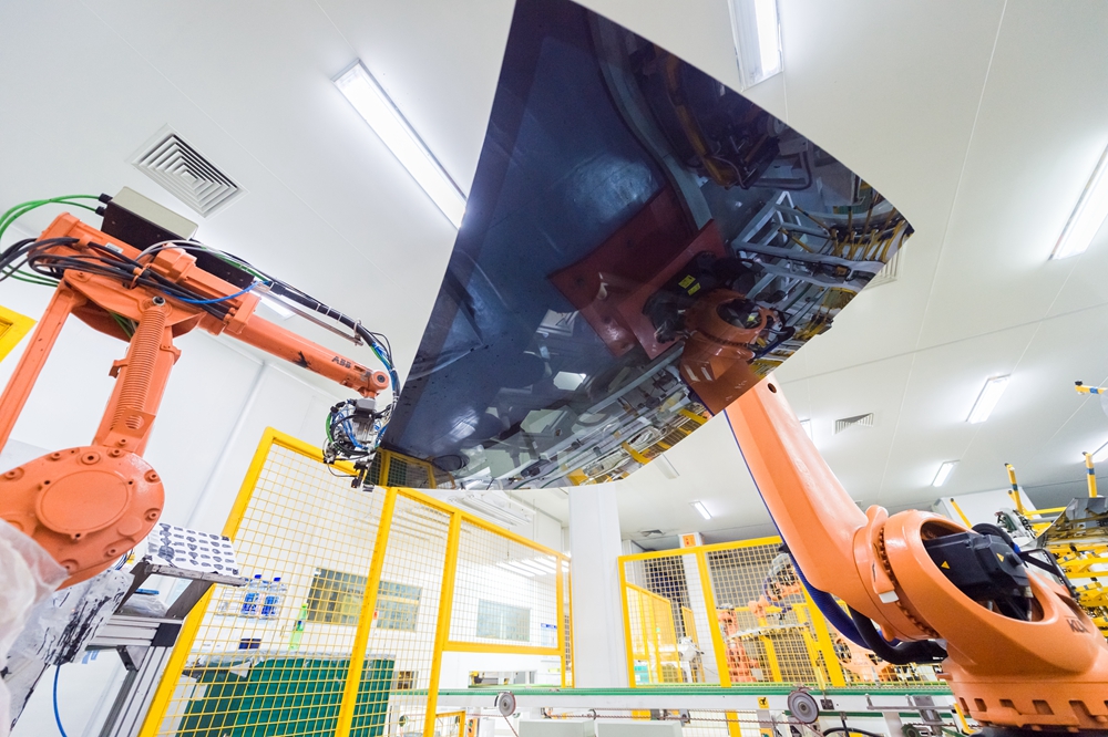 機(jī)械臂在福耀汽車玻璃智能工廠的車間生產(chǎn)玻璃產(chǎn)品