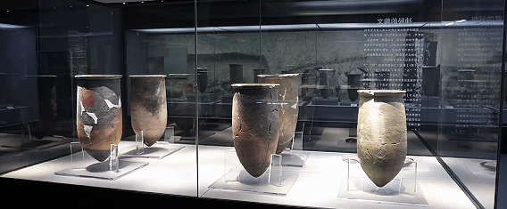“這是一件出土于安徽蒙城新石器時代尉遲寺遺址的大口陶尊,距今大約4800年。”講解員指著一件陶器展品,“它的特別之處是器物上有著刻畫符號,分別是‘日’‘月’‘山’形。抽象的表達和組合,已經(jīng)超越了簡單的圖畫,使我們看到了漢字的雛形?!?/p>