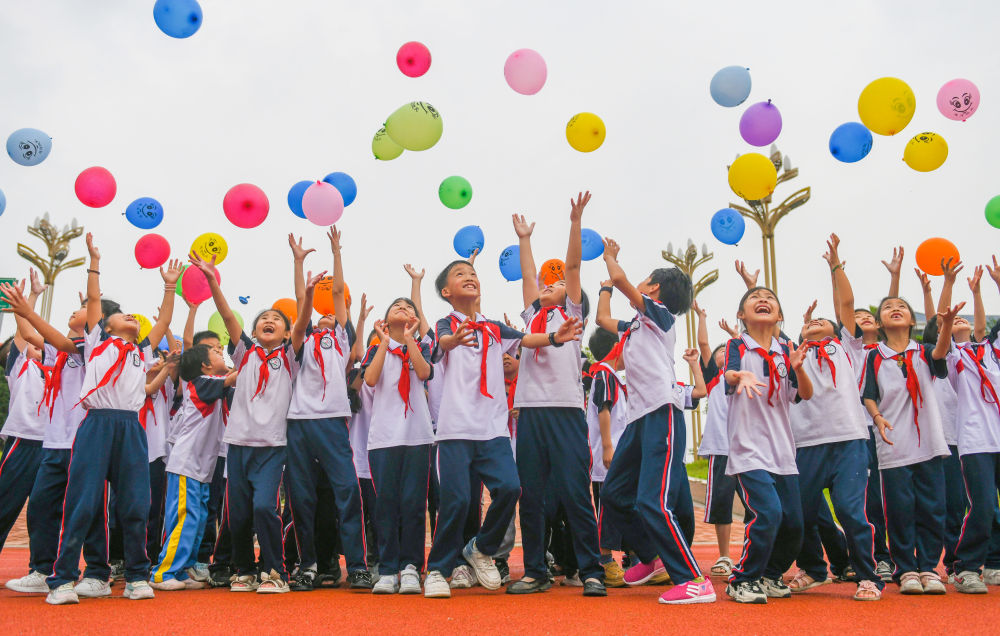 2024年5月8日,在湖南省永州市道縣第二小學,學生放飛笑臉氣球。新華社發(fā)(蔣克青 攝)