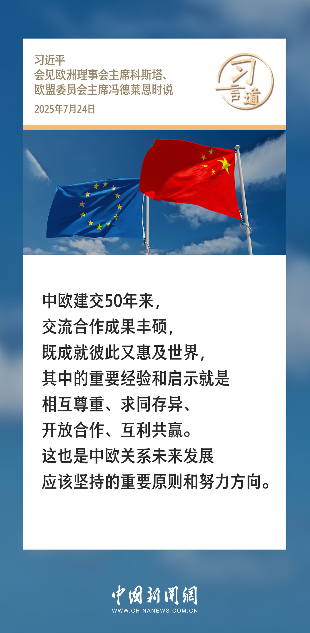 7月24日,國家主席習近平在北京人民大會堂會見來華舉行第二十五次中國-歐盟領導人會晤的歐洲理事會主席科斯塔和歐盟委員會主席馮德萊恩。習近平指出——