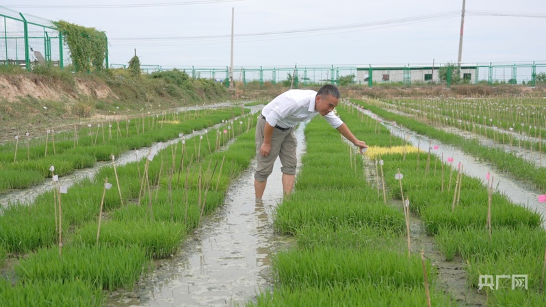 王仕明觀察不同品種水稻的生長(zhǎng)情況(央廣網(wǎng)記者 索迪 攝)