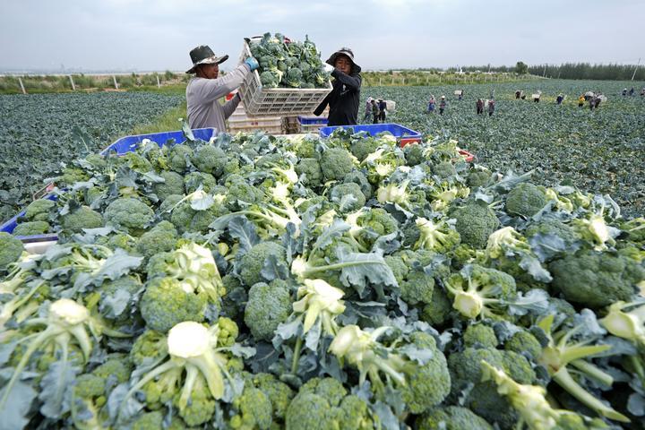 2025年7月18日,工作人員在寧夏固原市原州區(qū)彭堡鎮(zhèn)萬畝冷涼蔬菜基地運(yùn)輸西蘭花。固原依托高海拔、氣候冷涼等“冷資源”優(yōu)勢,大力發(fā)展冷涼蔬菜產(chǎn)業(yè),著力打造“六盤山冷涼蔬菜”區(qū)域公用品牌。目前已建成冷涼蔬菜規(guī)?;N植基地130余個,種植面積穩(wěn)定在50萬畝,年產(chǎn)鮮菜200萬噸以上?!傲P山冷涼蔬菜”這張打造的“綠色名片”,已成為當(dāng)?shù)剜l(xiāng)村振興發(fā)展之路上的“熱產(chǎn)業(yè)”