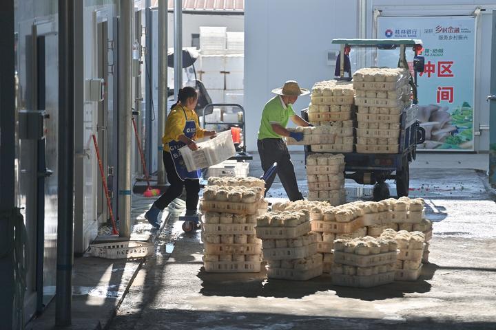 2024年10月31日,村民在廣西百色市德保縣那造村食用菌生產(chǎn)基地搬運(yùn)采摘的蘑菇。那造村通過做優(yōu)特色產(chǎn)業(yè)、豐富村民生活、完善基礎(chǔ)設(shè)施等多項具體舉措,推動各項事業(yè)快速發(fā)展。