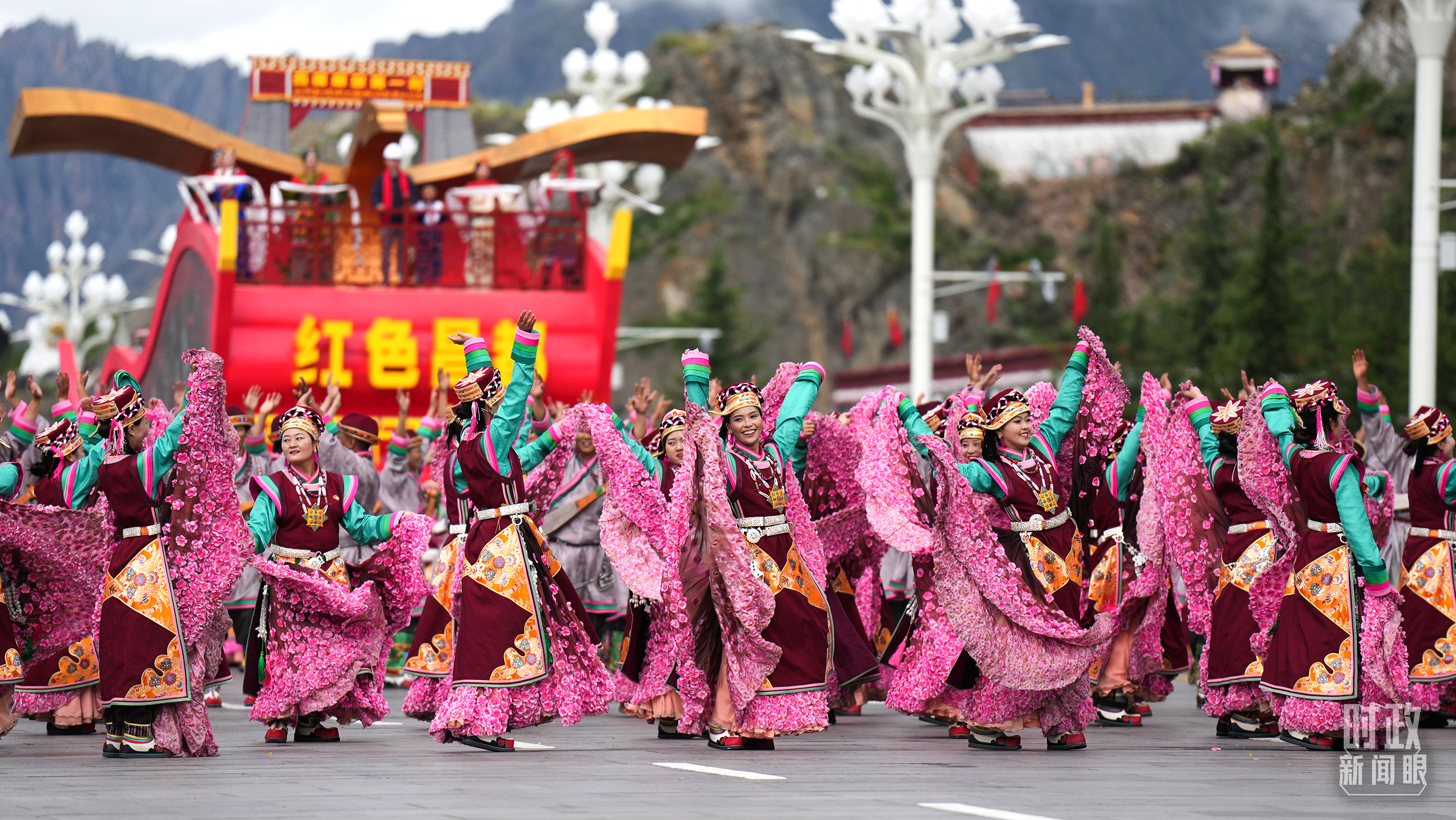 在“奮進(jìn)新時(shí)代”單元中,西藏7個(gè)地市的游行方隊(duì)和彩車獨(dú)具風(fēng)格,是生動(dòng)展現(xiàn)地方特色的窗口。例如,“幸福拉薩”彩車的雪蓮花、“開放的日喀則”彩車的云端哨所、“藏源山南”彩車的雅魯藏布江、“醉美林芝”彩車的桃花、“紅色昌都”彩車的西藏解放第一村、“極地那曲”彩車的藏羚羊、“天上阿里”彩車的岡底斯山脈等。